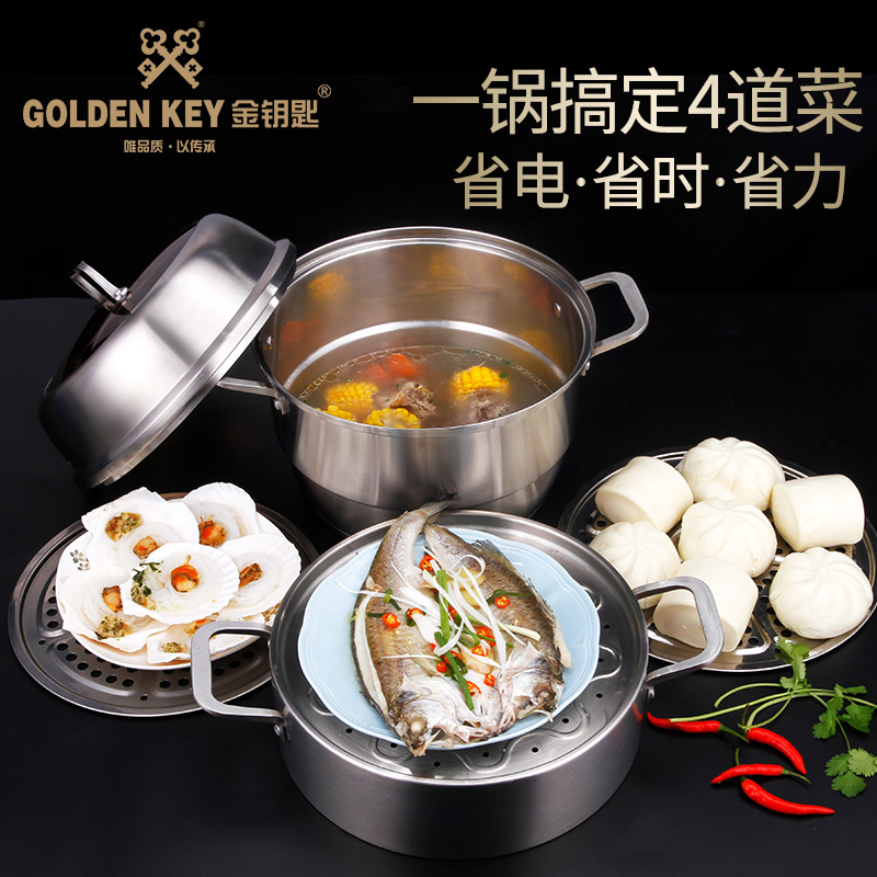 金钥匙304不锈钢蒸锅三层多层蒸馒头蒸笼3层加厚二层家用电磁炉