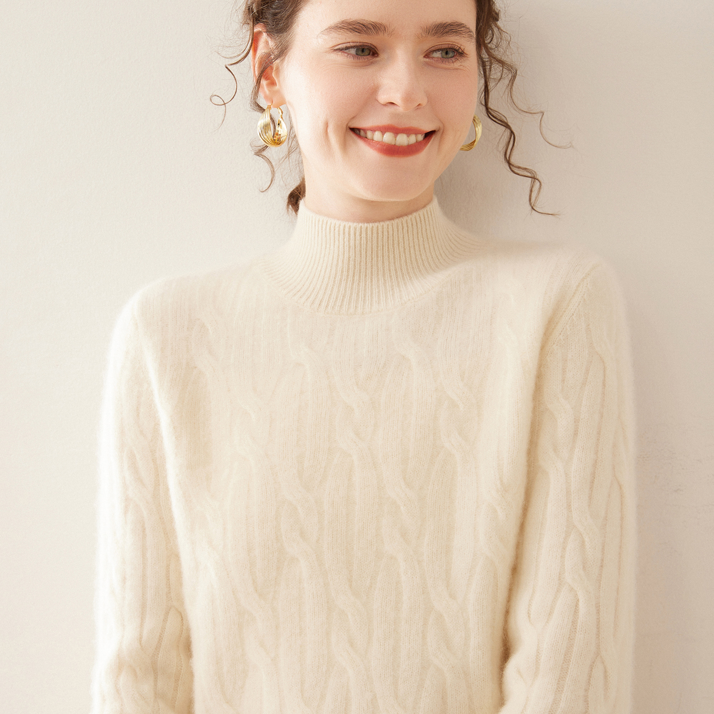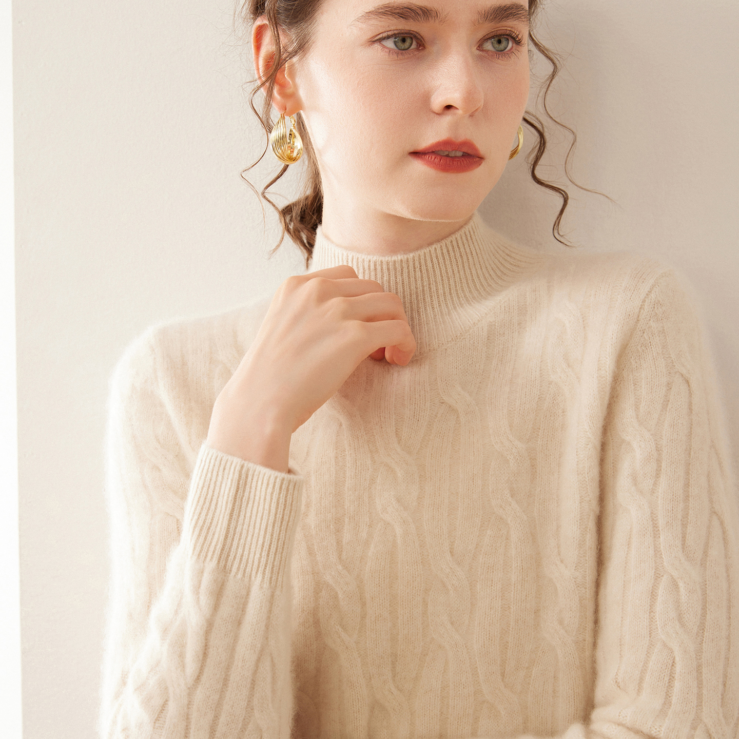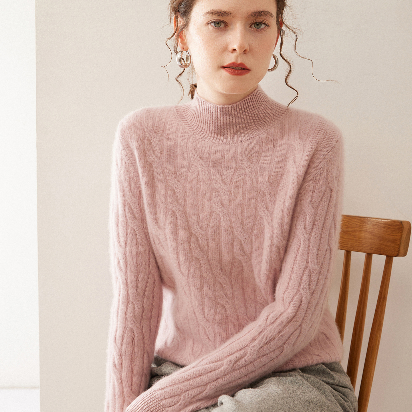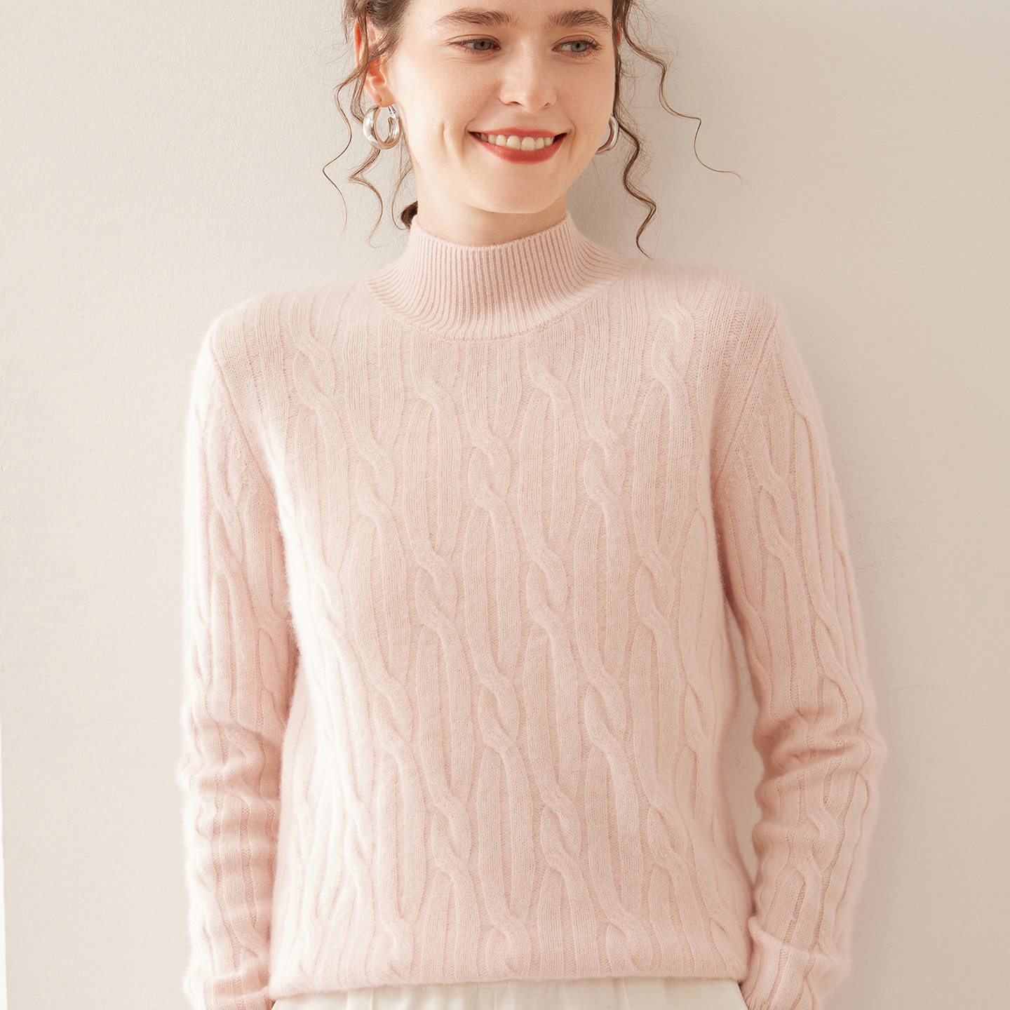 100%纯山羊绒衫女半高领加厚麻花毛衣秋冬新款宽松套头纯色打底衫