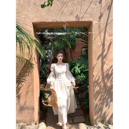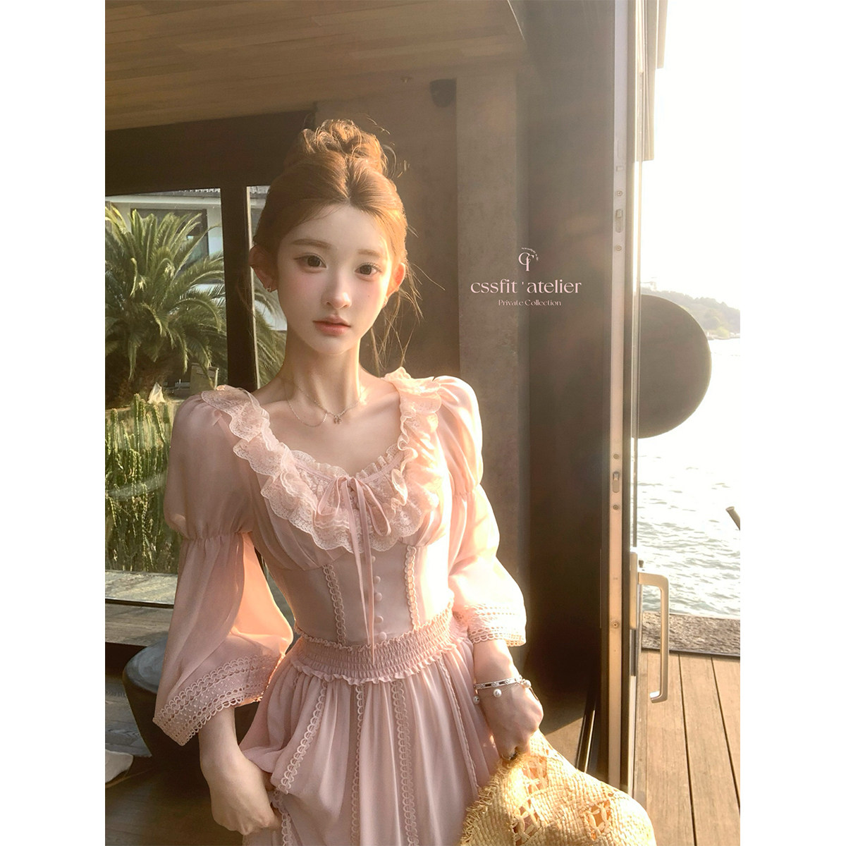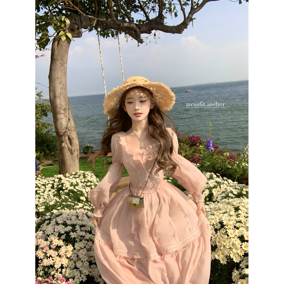 迟伞伞 25/ss 雾岛香草 重工定染蕾丝长袖仙女系带连衣裙收腰长裙