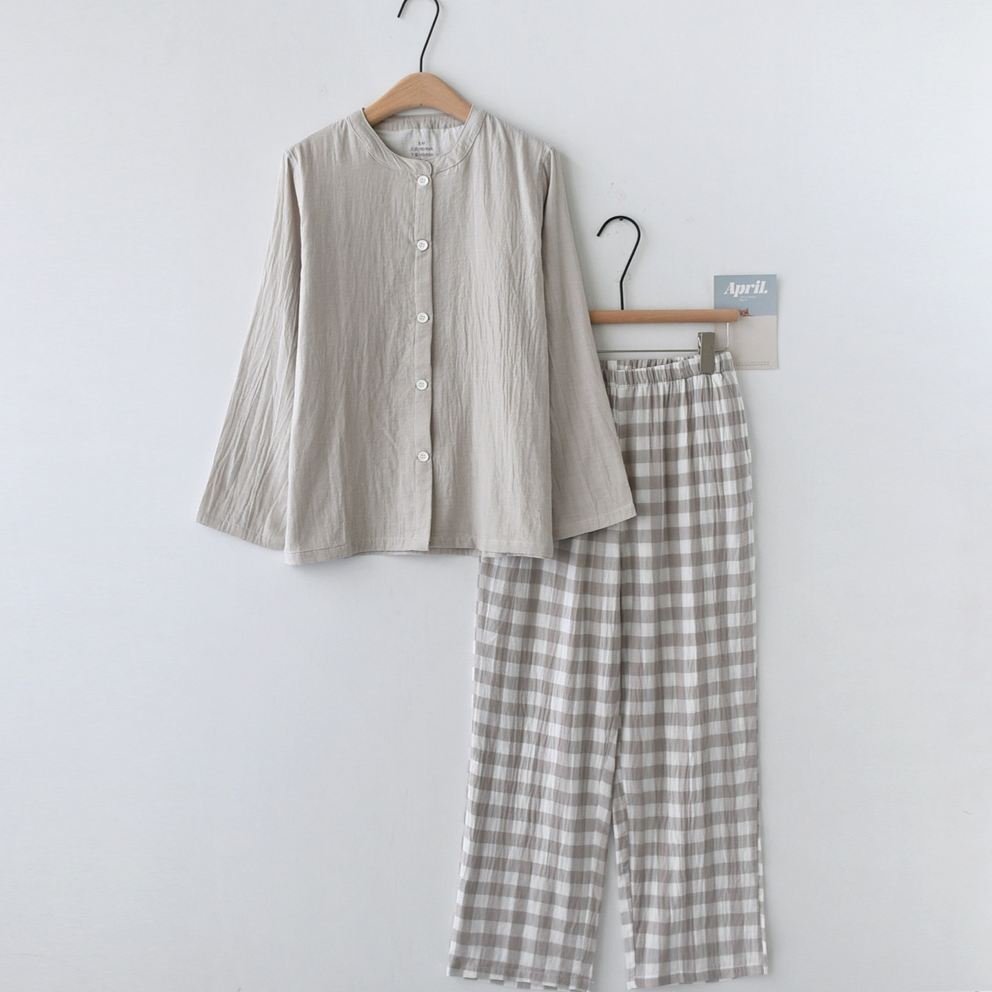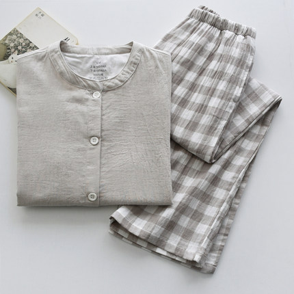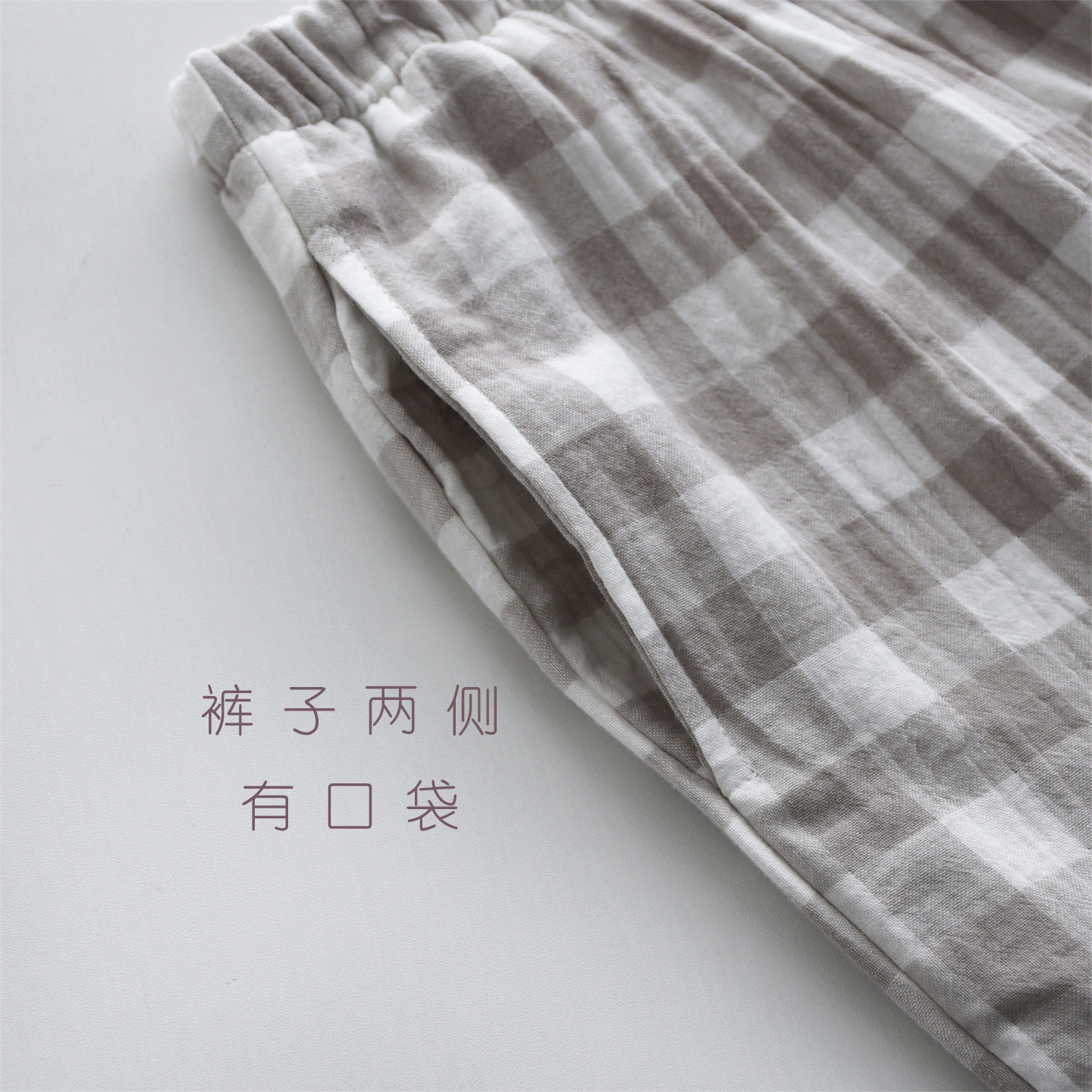 无印风AB款格子睡衣男女款春夏季纯棉纱布薄款宽松长袖家居服套装
