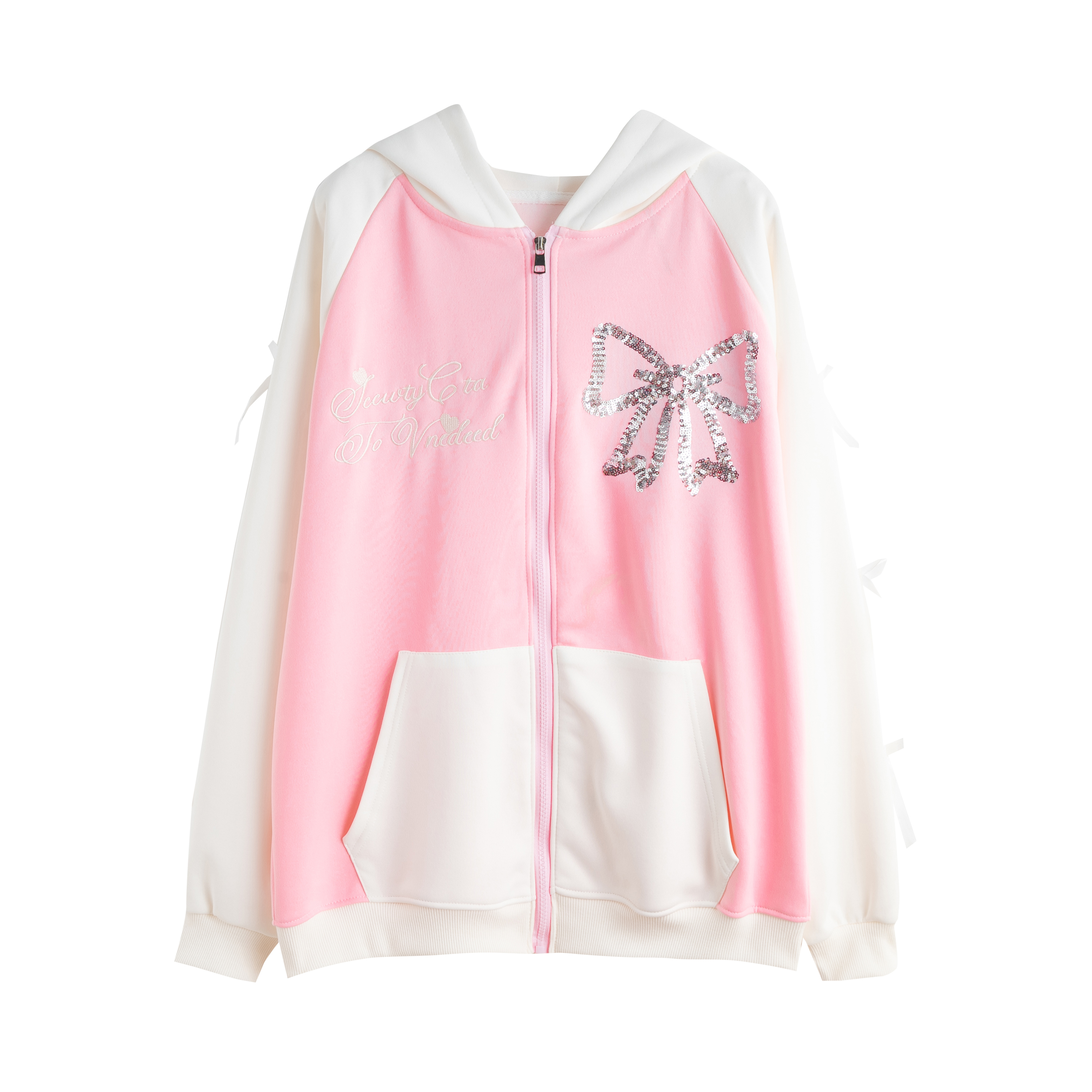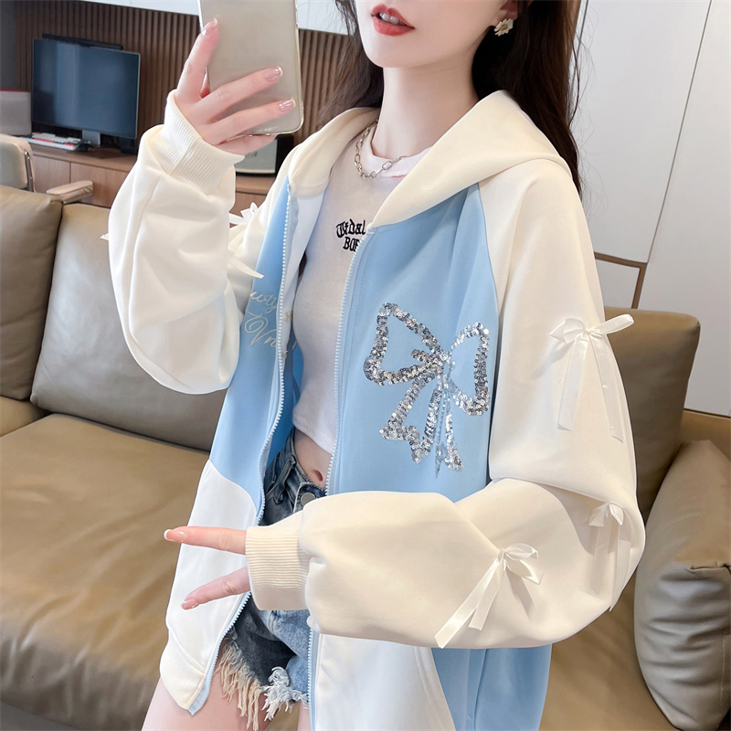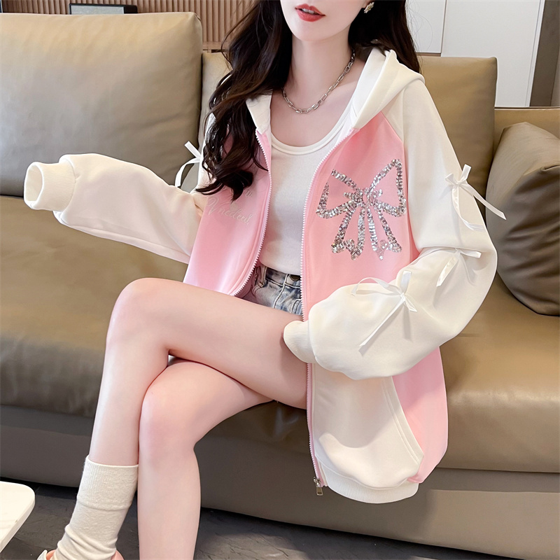 早秋设计感小众蝴蝶结外套女春秋季韩版宽松大码薄款撞色开衫卫衣