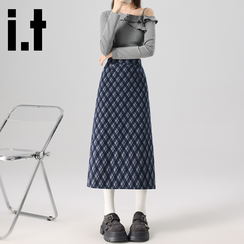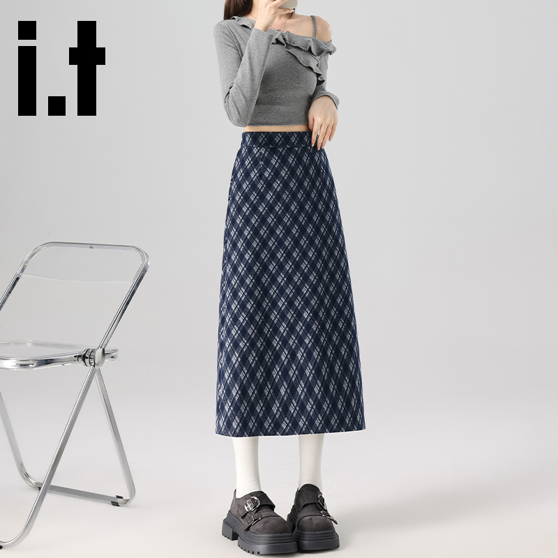 it:CHOCOOLATE复古毛呢半身裙女春秋格纹后开叉垂坠感A字版长裙子