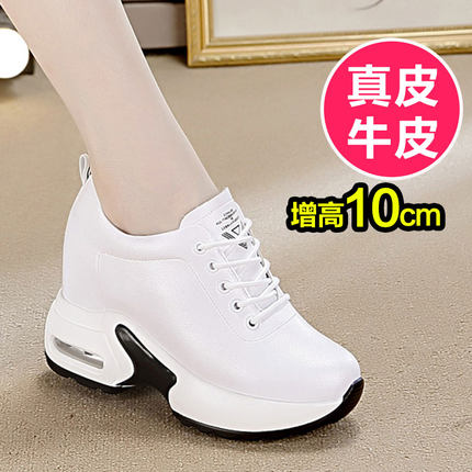 真皮内增高小白鞋女10cm春秋季时尚百搭休闲运动厚底坡跟单鞋软底