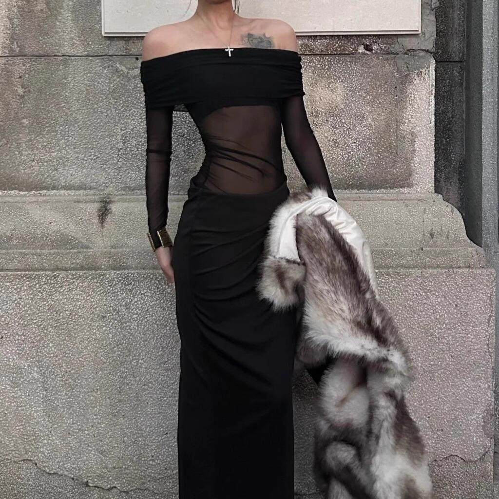 Amyway【法式宴会】优雅性感气质女人蕾丝拼接网纱一字肩连衣裙