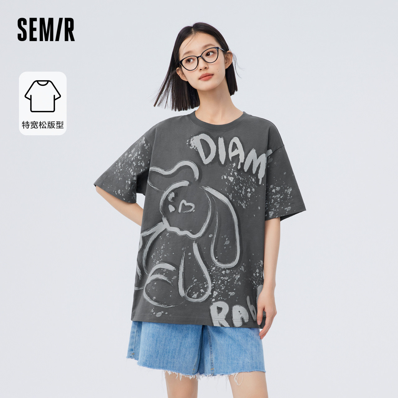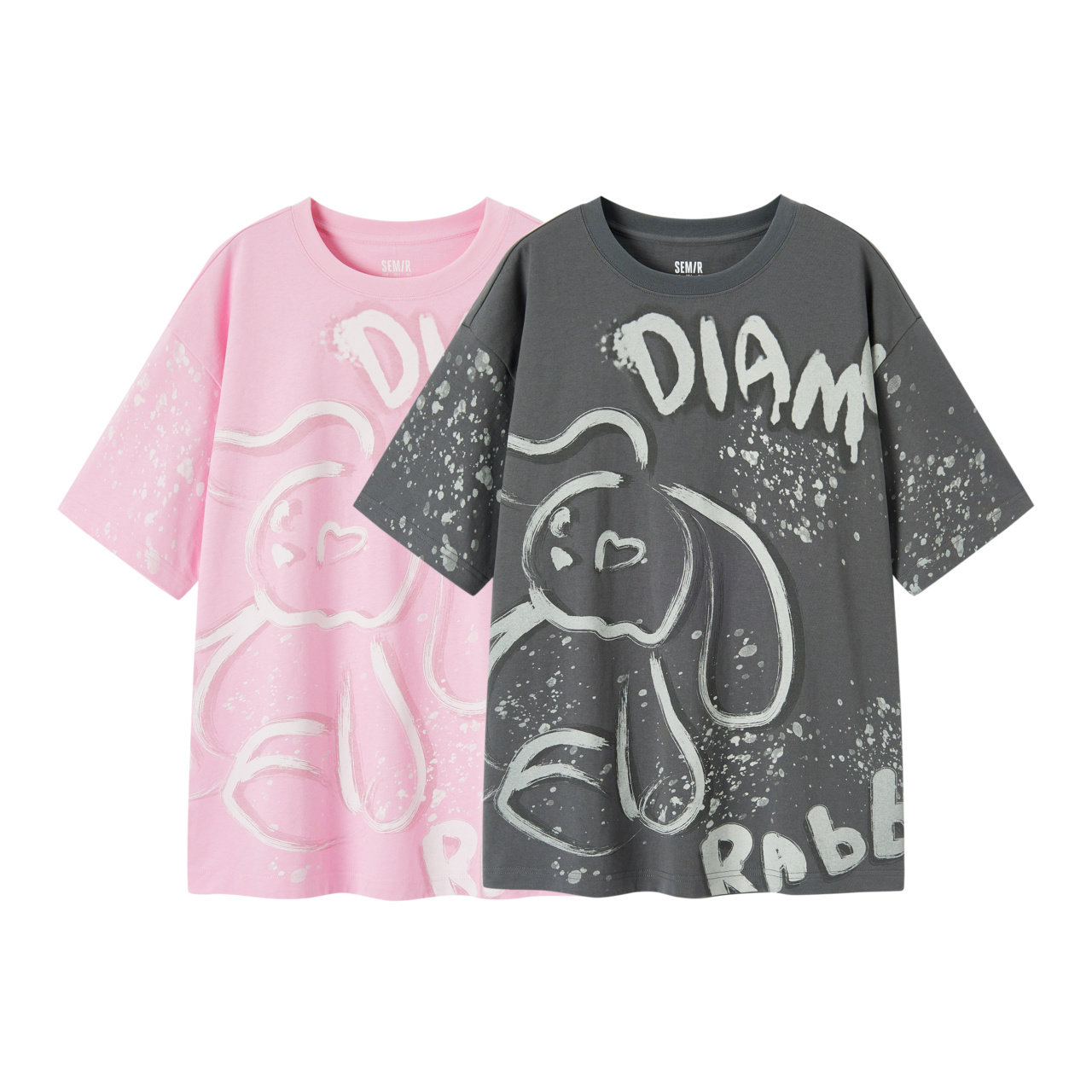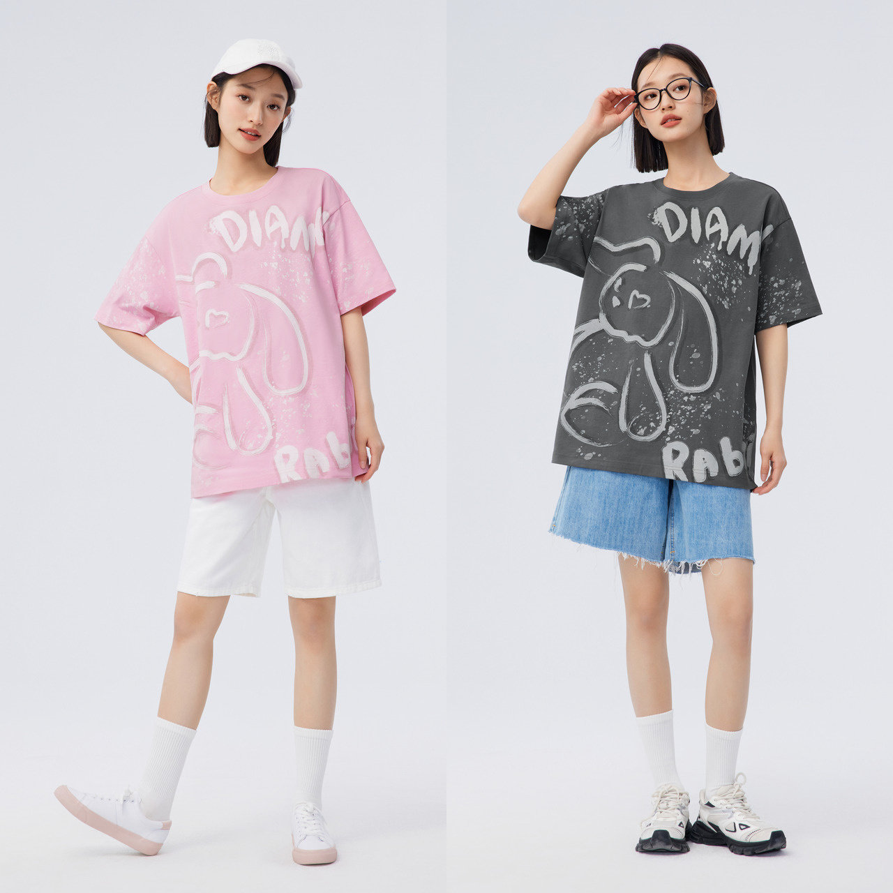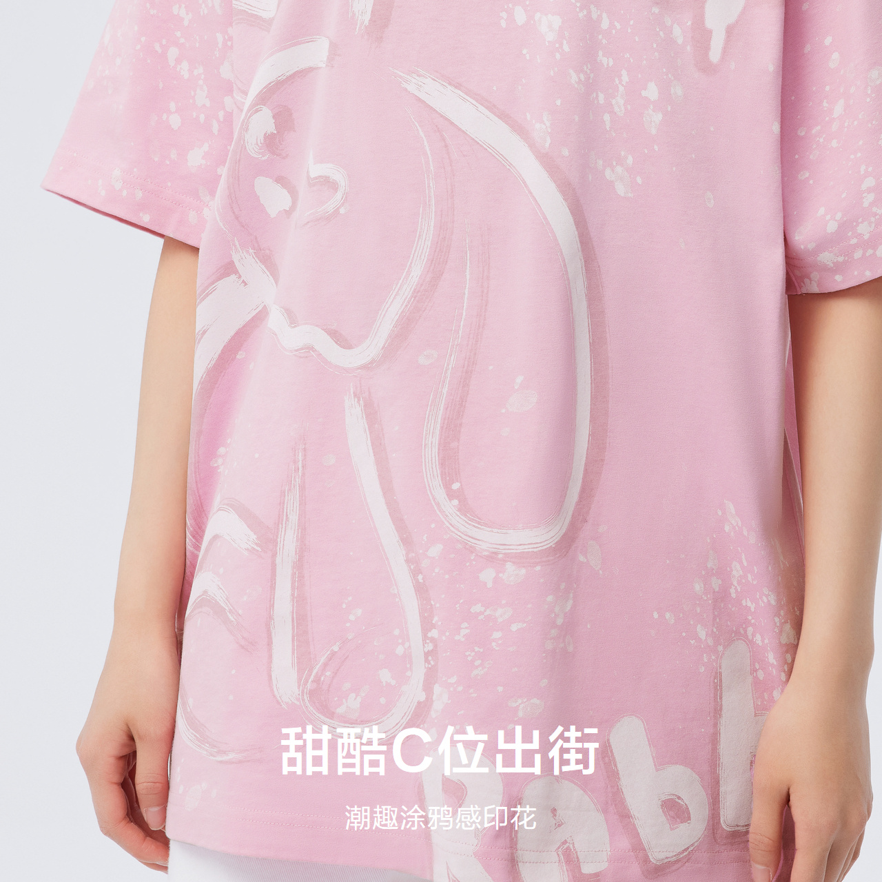 森马短袖T恤女中长款2024夏季新款oversize宽松粉色兔子纯棉上衣