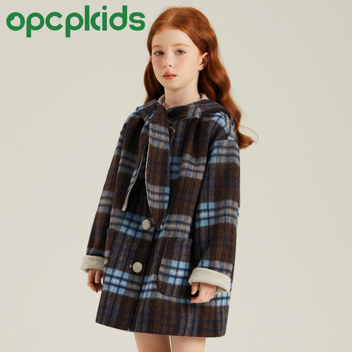 OPCP儿童双面羊绒大衣秋冬新款女童呢子外套中大童复古格子中长款