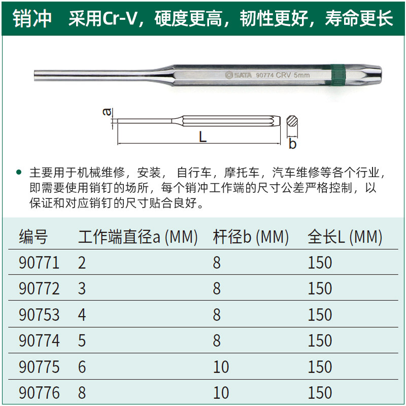 世达销冲圆柱冲钳工冲敲击冲子顶出冲圆凿子90771/90772/90775