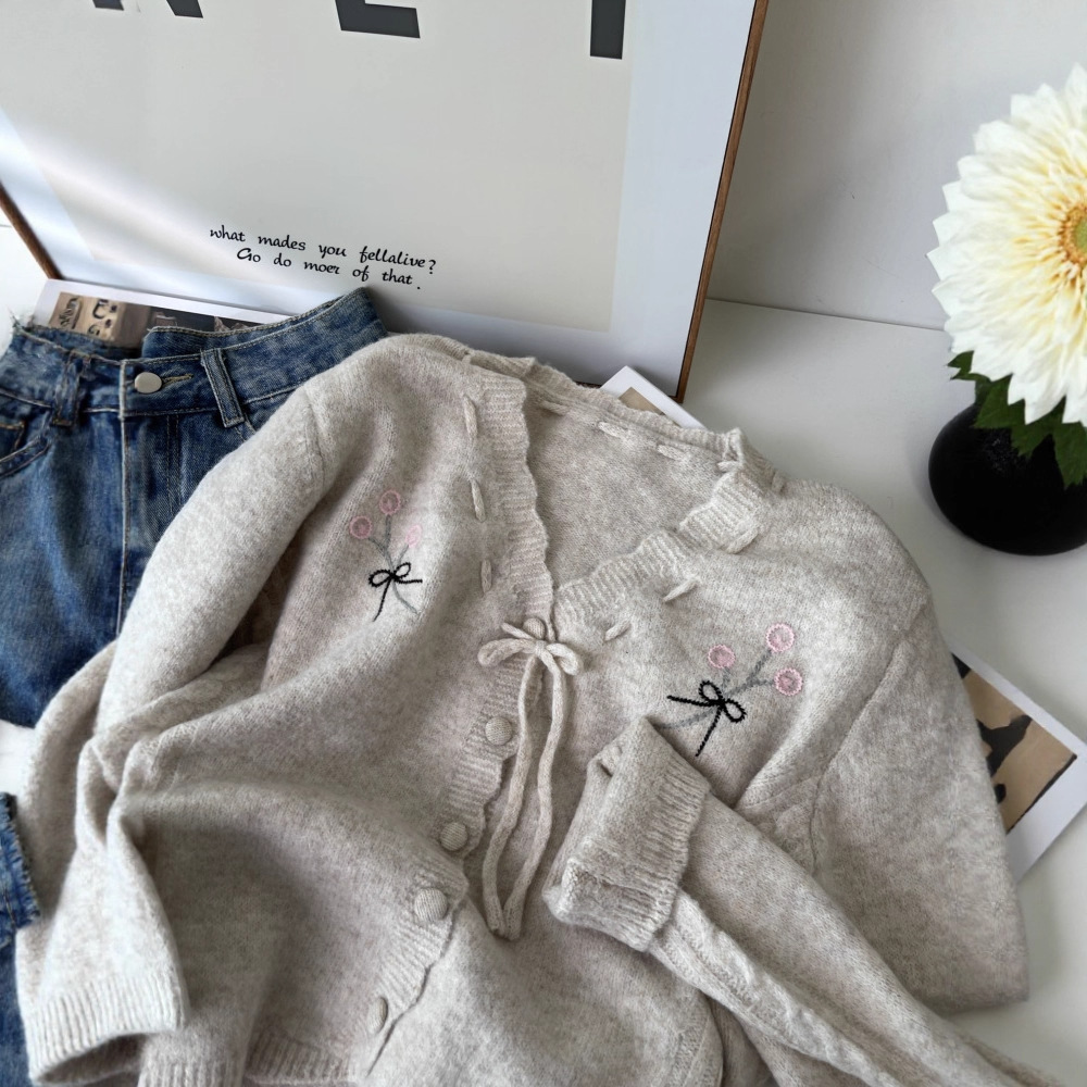 微笑向暖 钩花乖甜美baby蓝毛衣外套开衫 复古秋装针织温柔风上衣