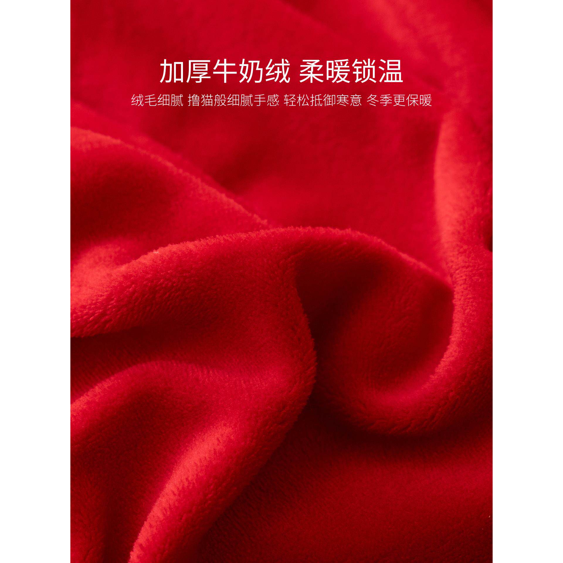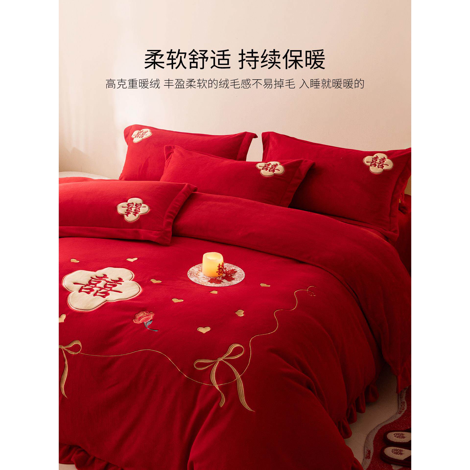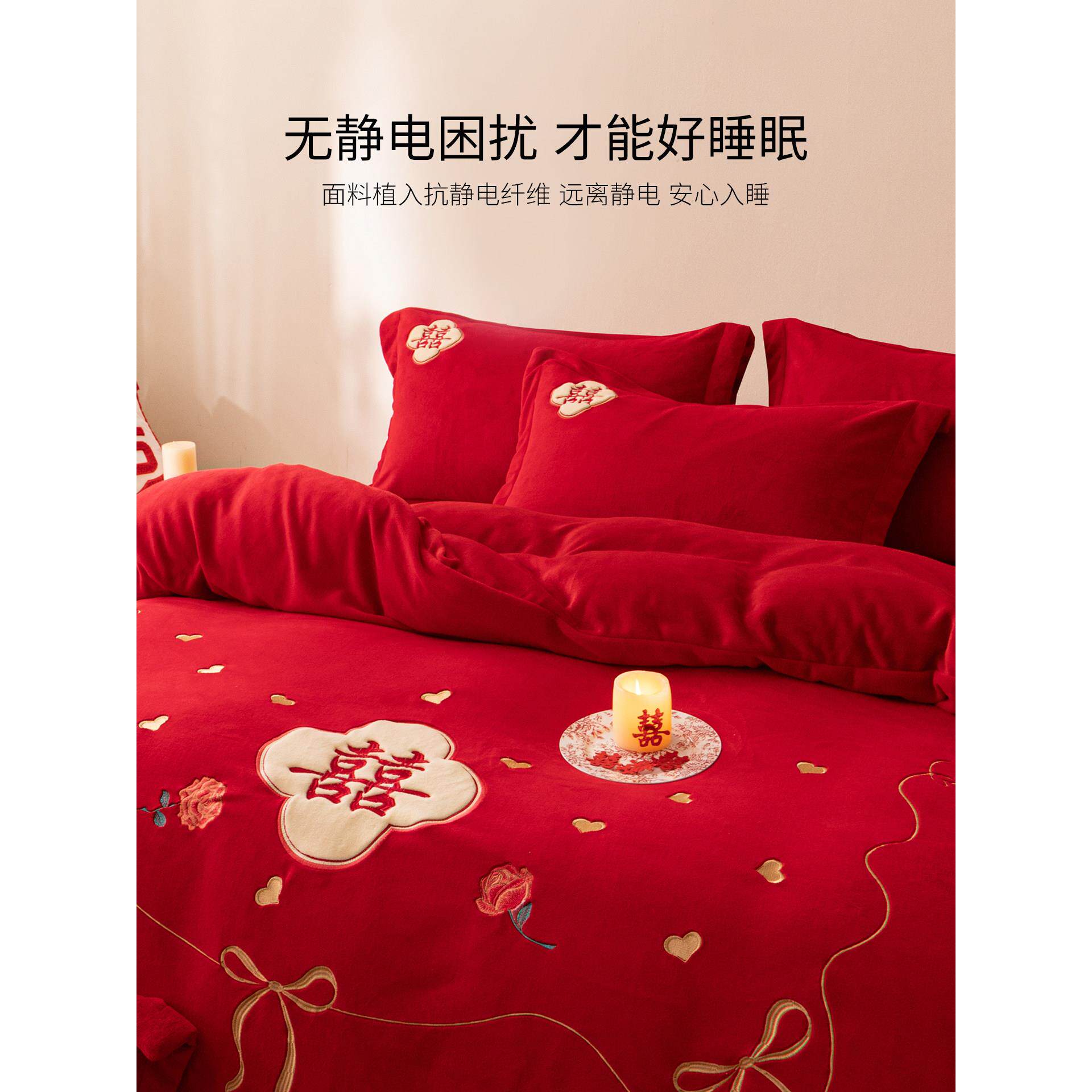 大红色牛奶绒结婚床上四件套婚庆刺绣床单被套秋冬季珊瑚毛绒床品