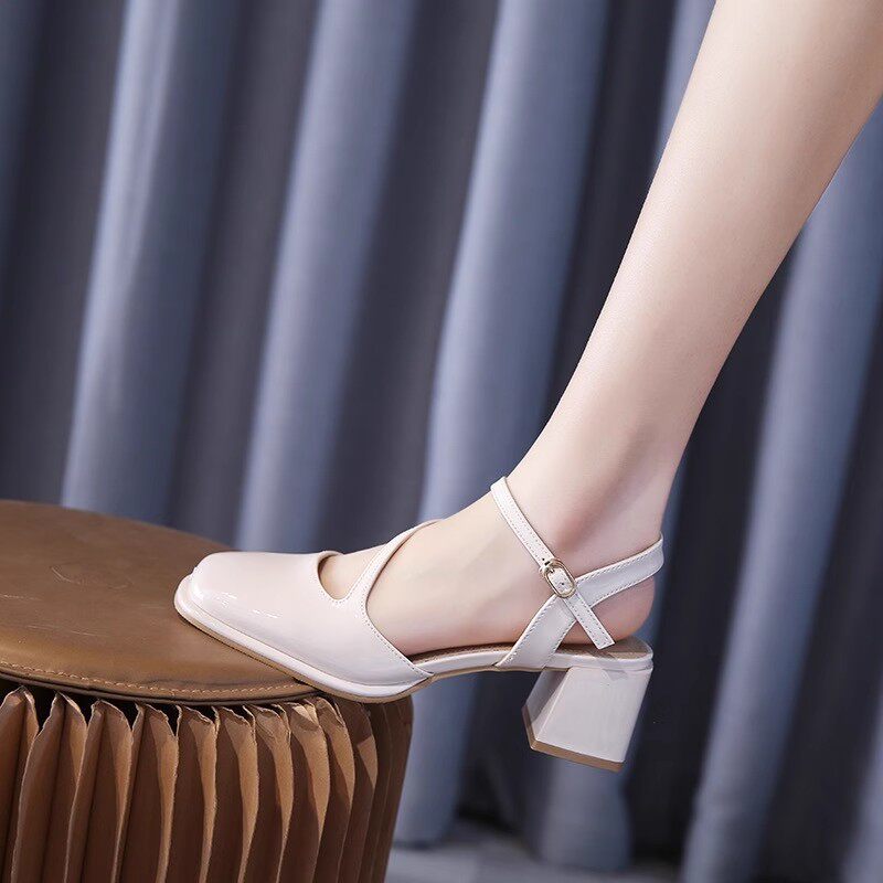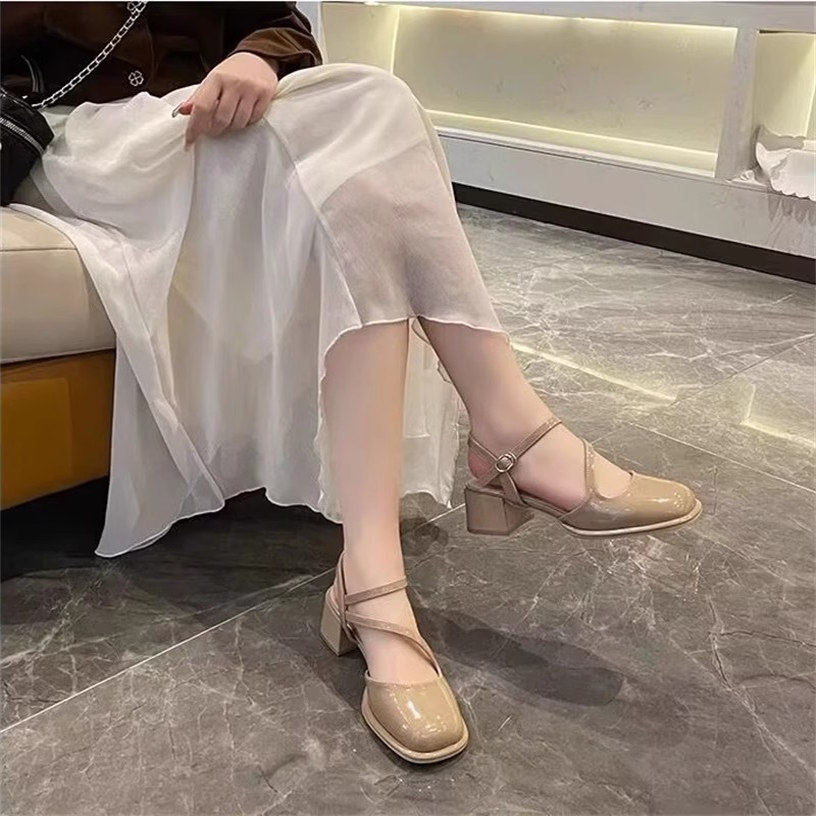 真皮羊漆皮时尚粗跟半包一字带玛丽珍凉鞋减龄日常百搭舒适333-2