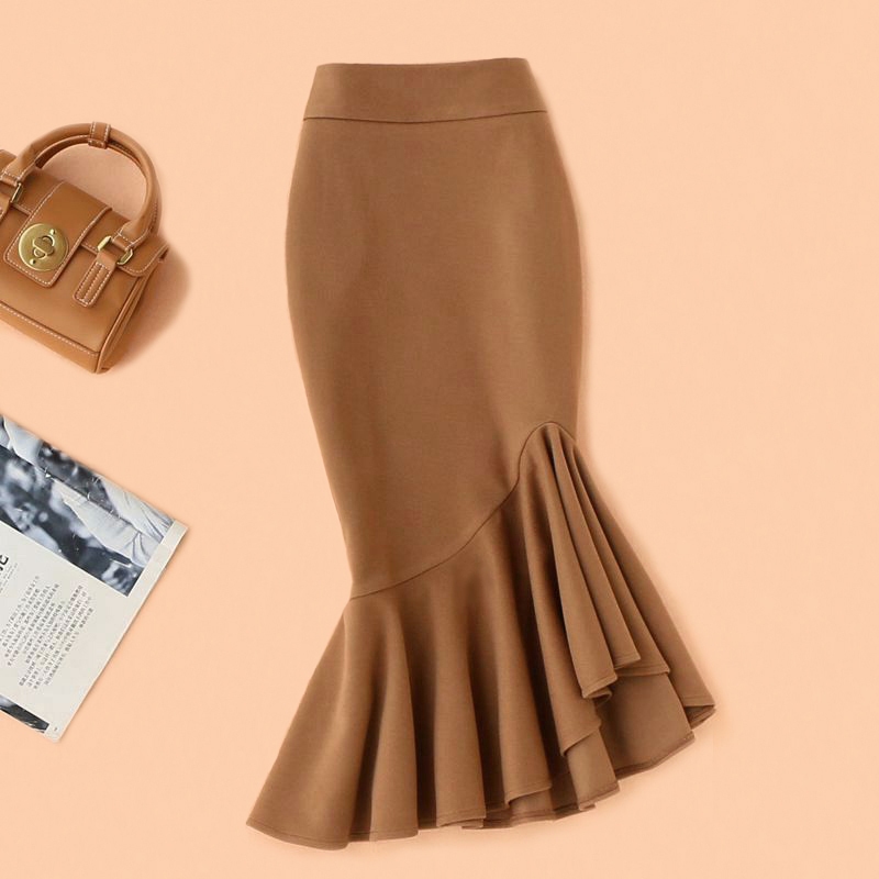 酒红色毛呢半身裙秋冬女不规则高腰弹力鱼尾裙中长款羊毛包臀裙子