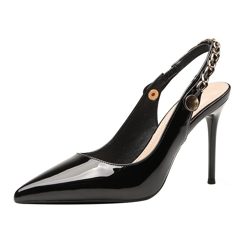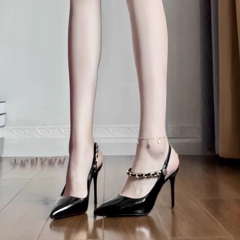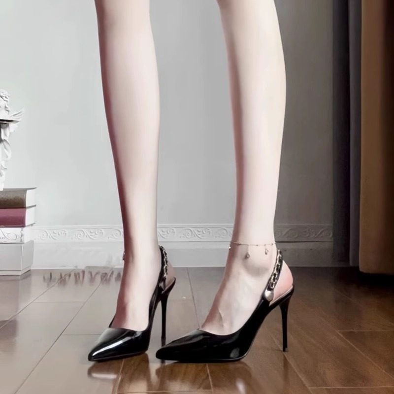 2025新款漆皮链条御姐性感黑色尖头细跟气质法式高跟鞋女包头凉鞋
