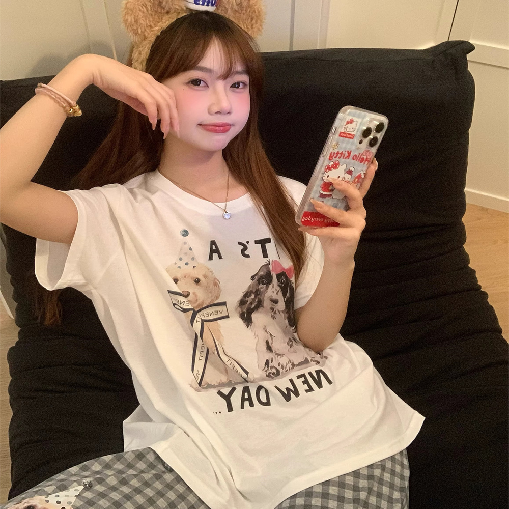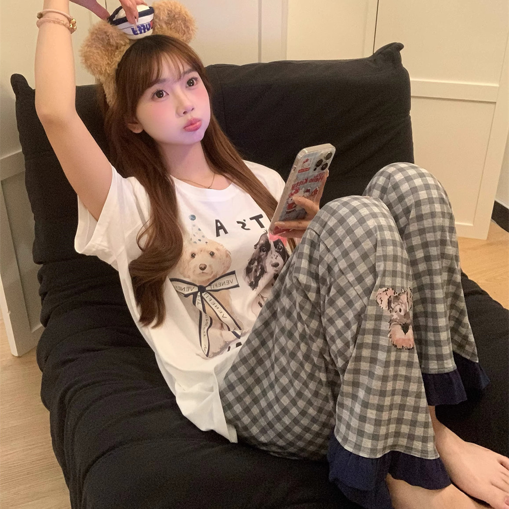 可爱小狗格子印花短袖睡衣女春夏2025新款大码长裤家居服套装外穿