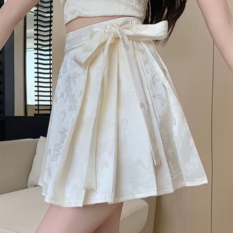 新中式马面裙百褶裙女夏季新款蝴蝶结设计感提花短裙防走光半身裙