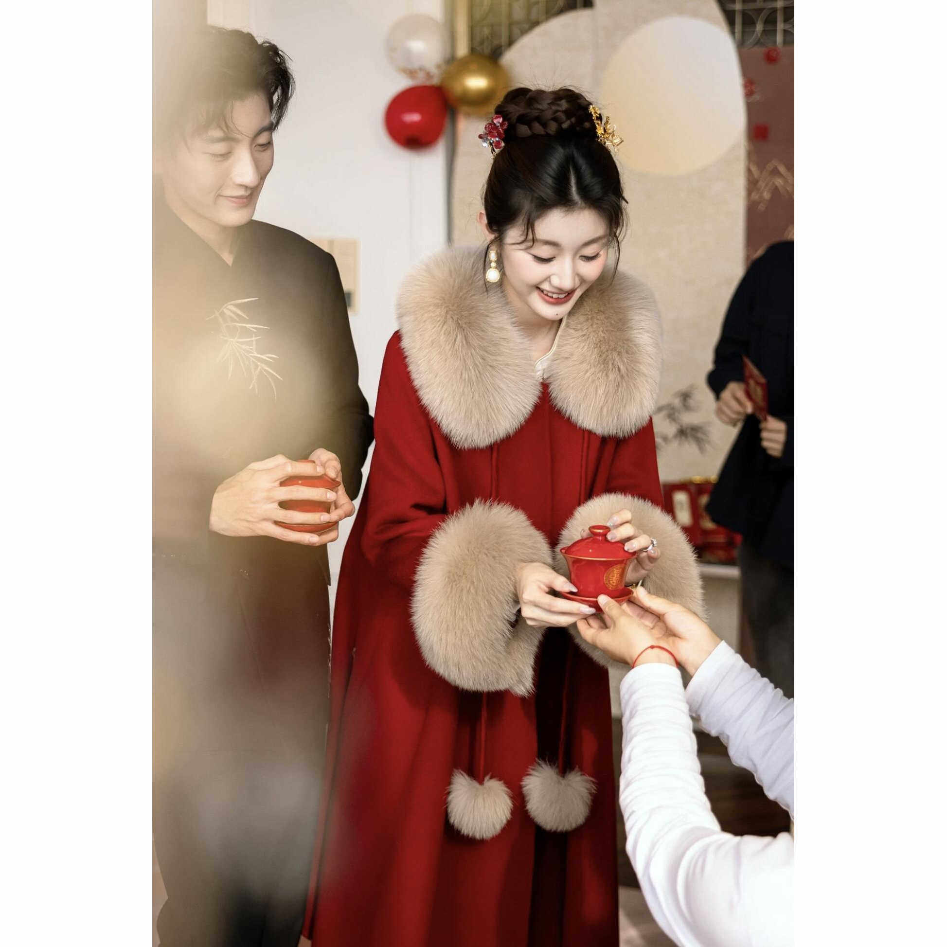 复古风高端毛领红大衣礼服女中长款宴会晚装外套结婚敬酒礼服保暖