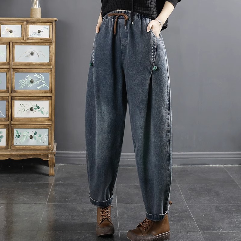 2025新款秋季复古松紧腰牛仔裤女老爹哈伦裤洗水休闲大码宽松长裤
