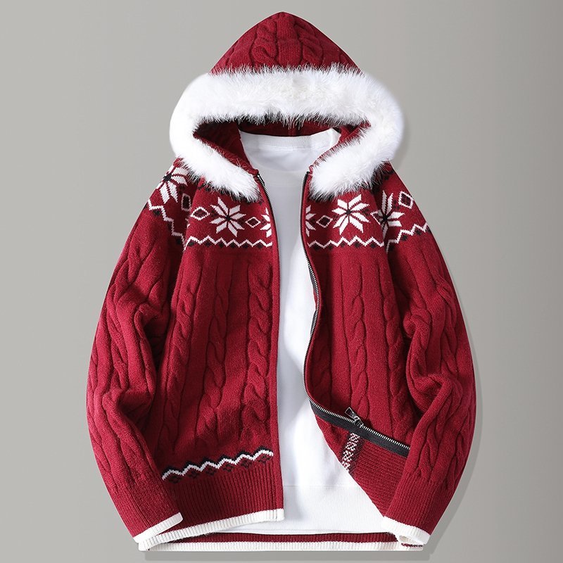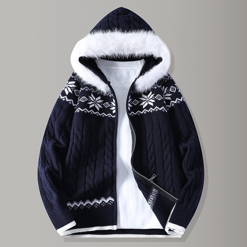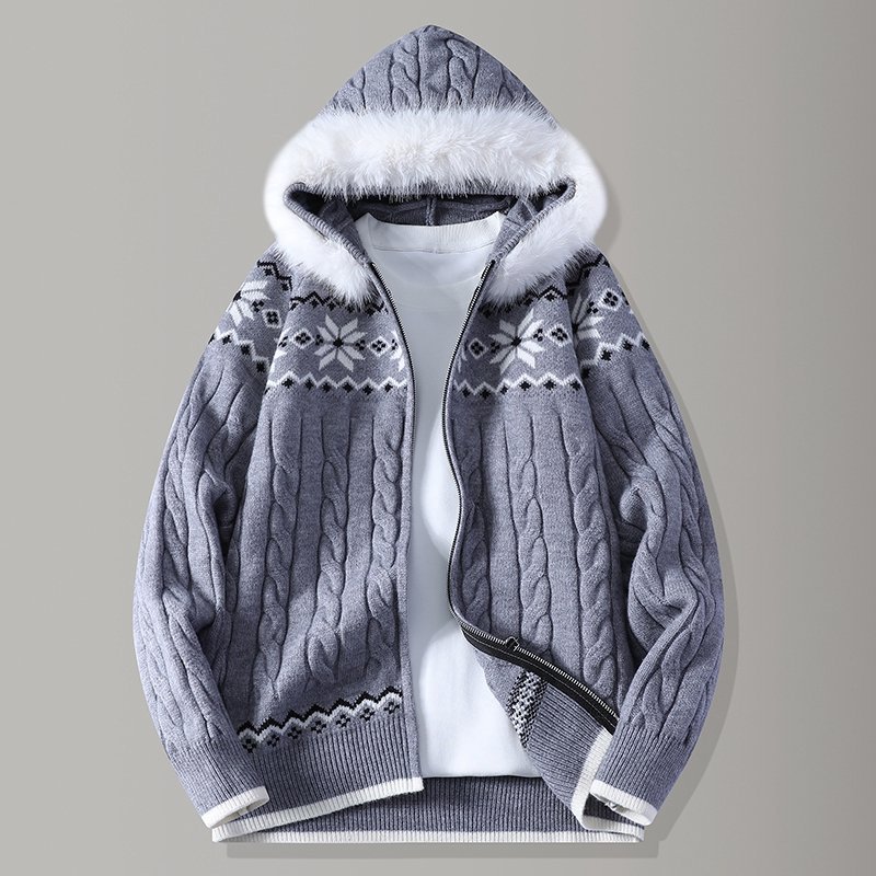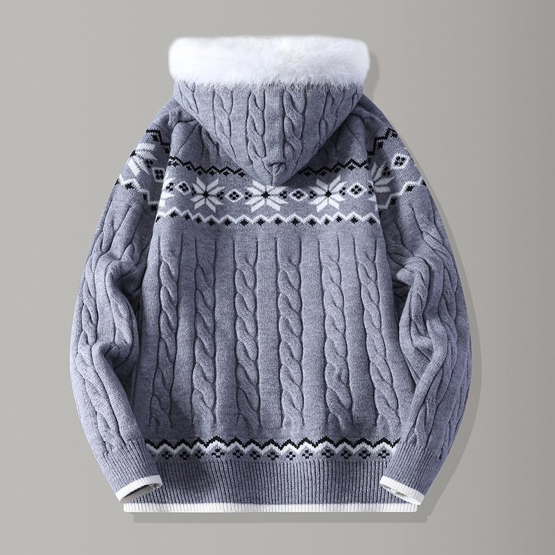 连帽大毛领费尔岛拉链针织开衫外套男青少年学生加厚毛衣男款以純