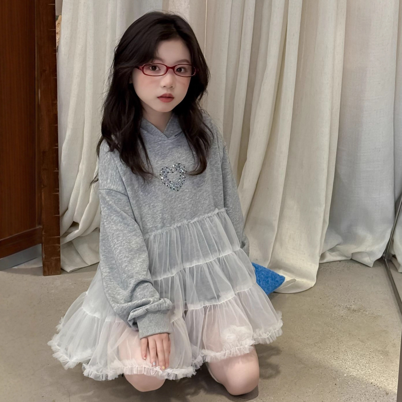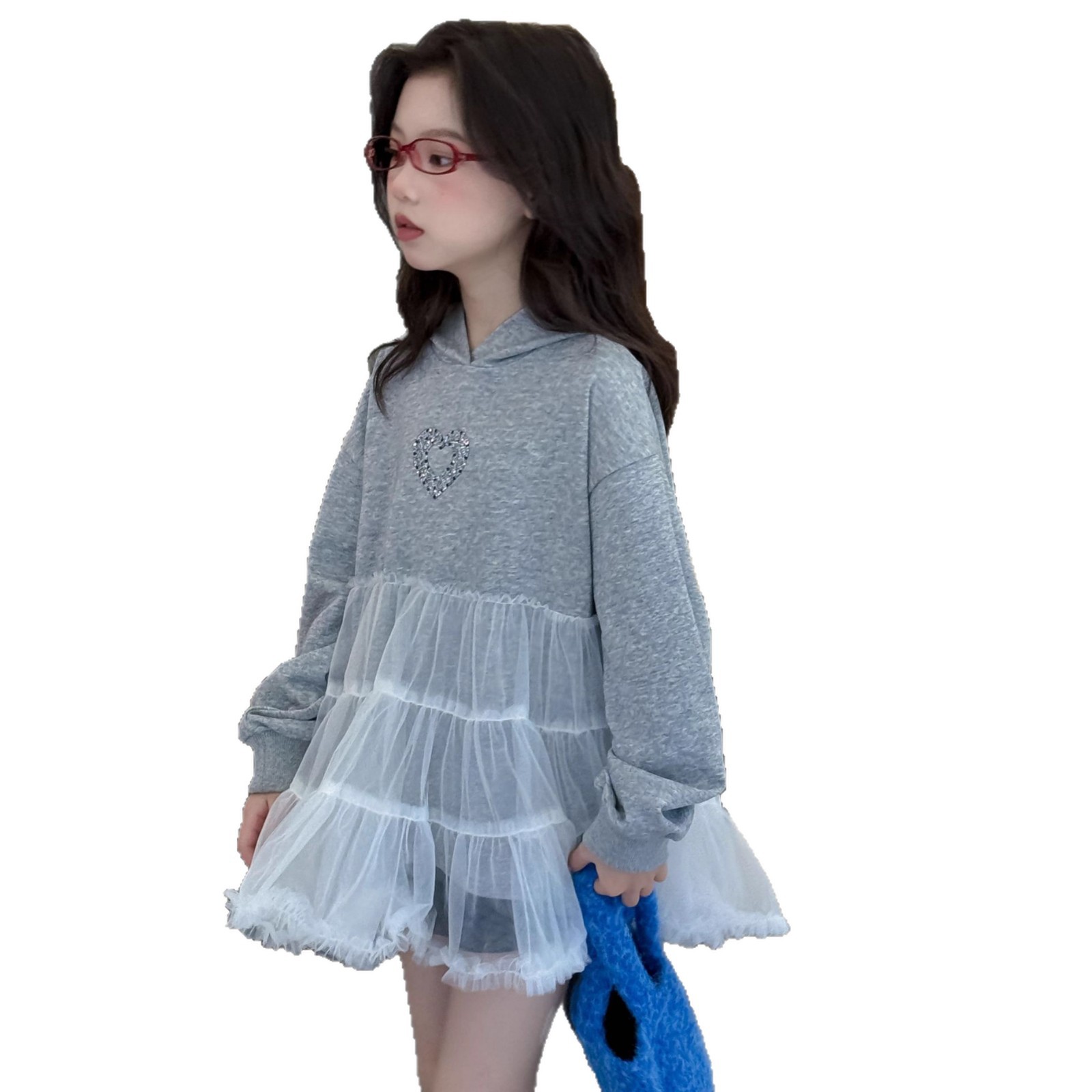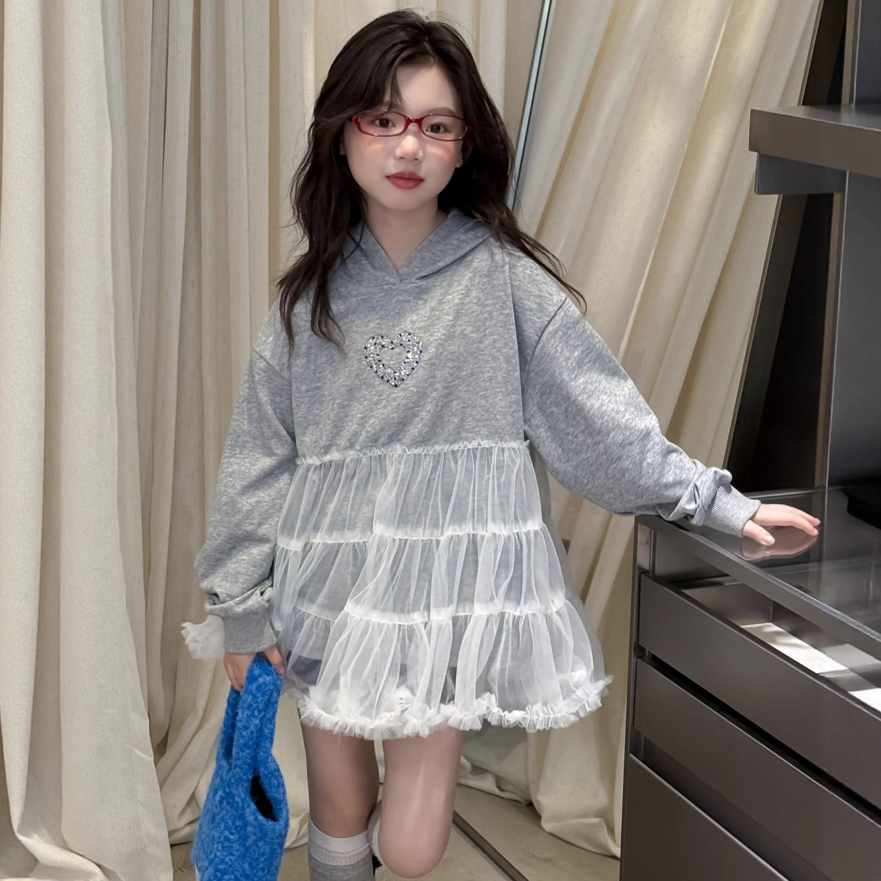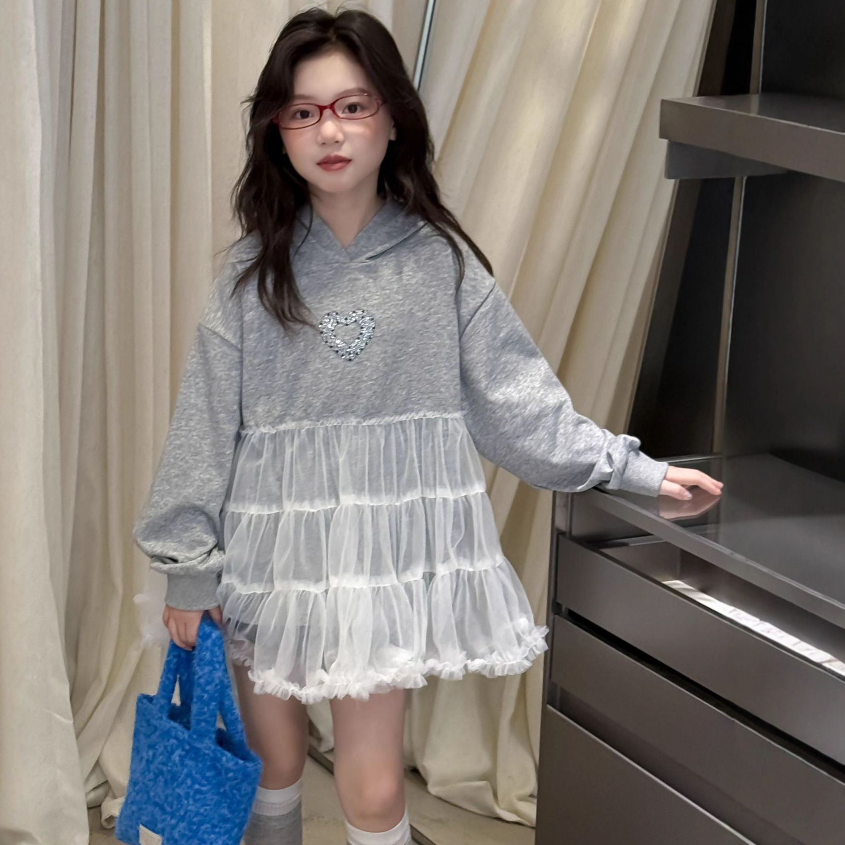 女童公主裙2025秋季新款女童爱心带钻连帽卫衣裙中大童女孩连衣裙