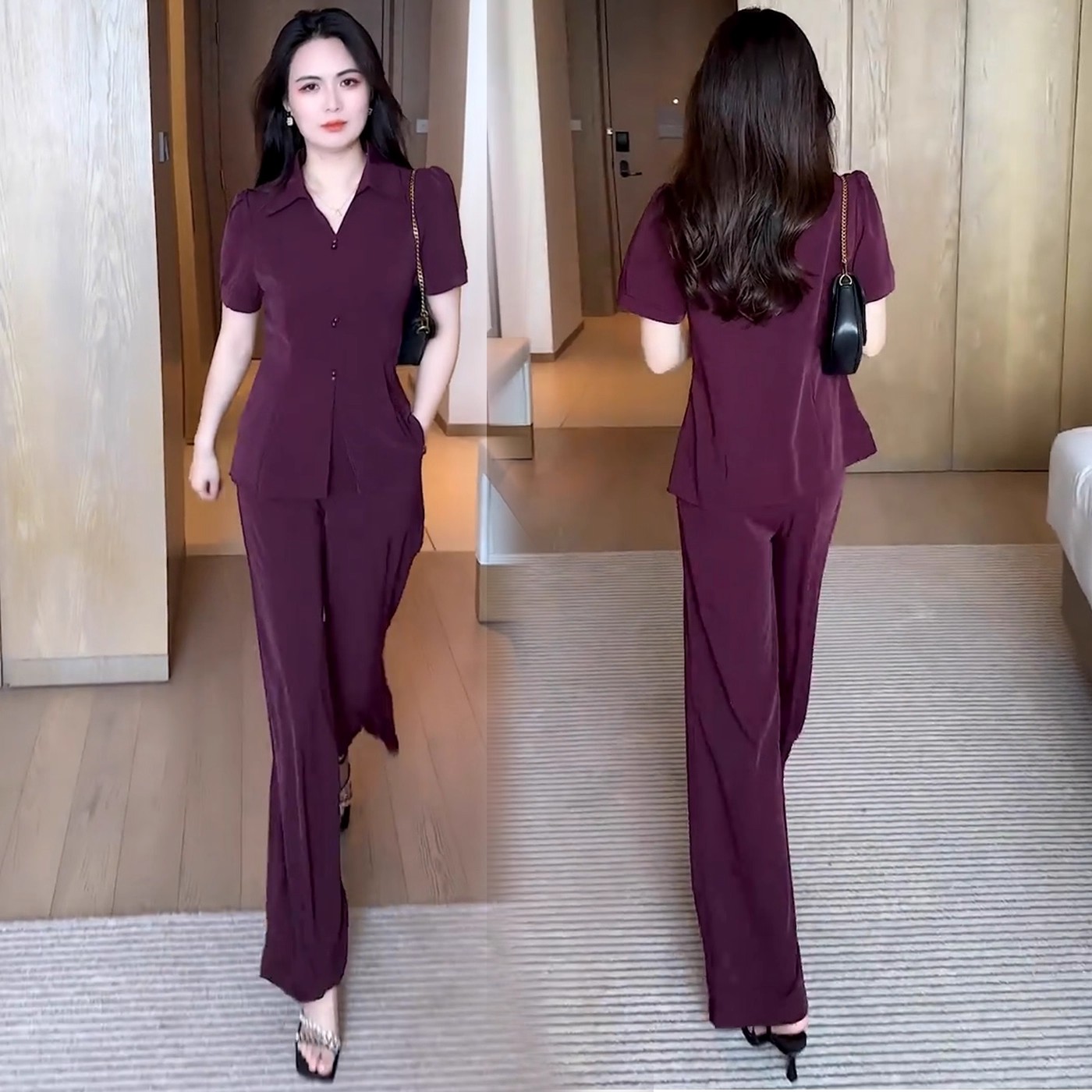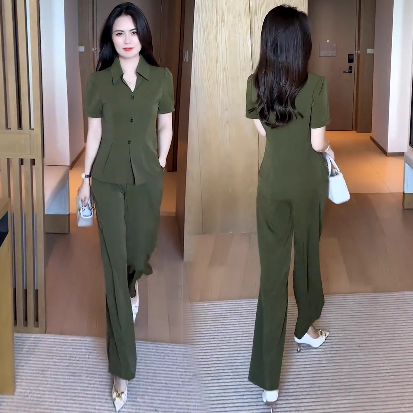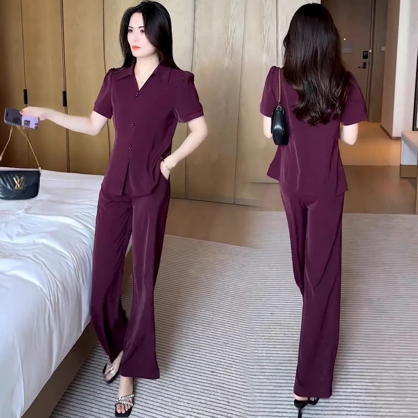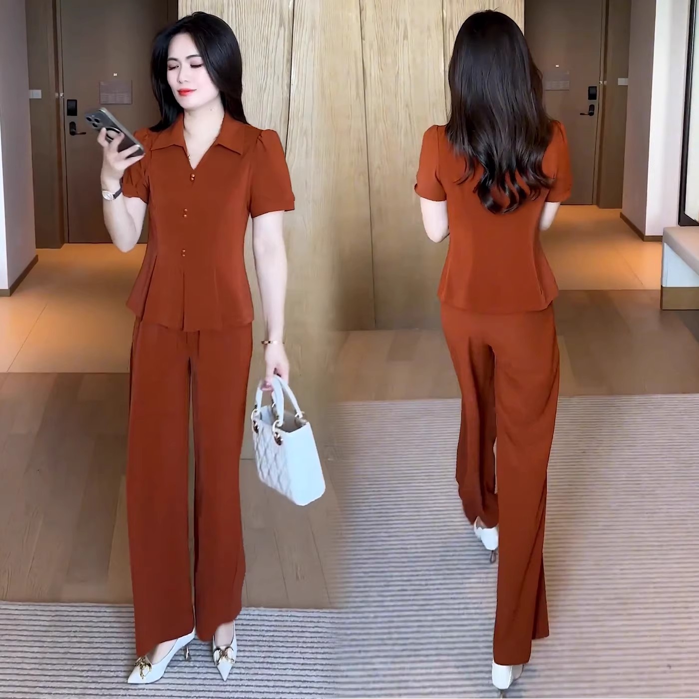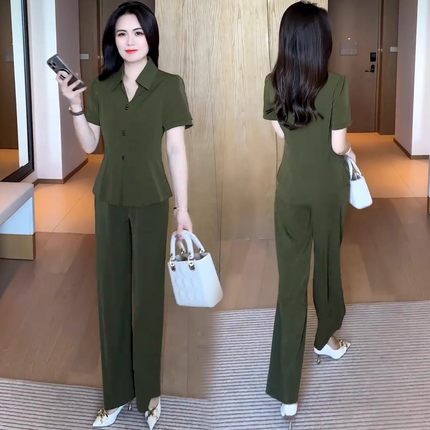 夏季时尚休闲套装女装2025新款大码收腰短袖衬衫阔腿裤穿搭两件套