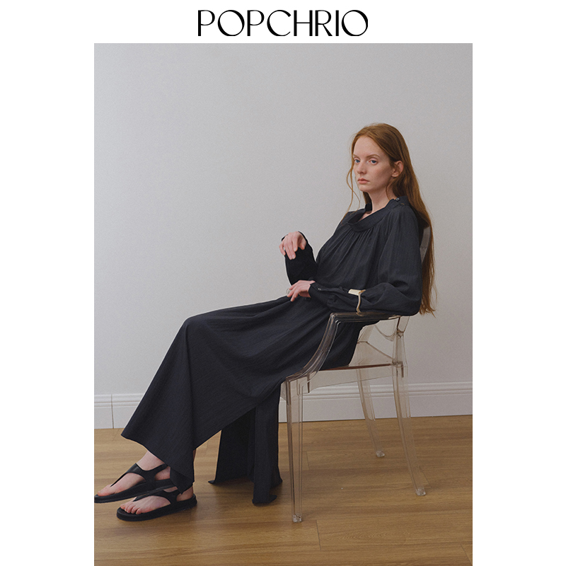 POPCHRIO欧可芮◆复古一字立领泡泡长袖连衣裙收腰中长款裙子宽松