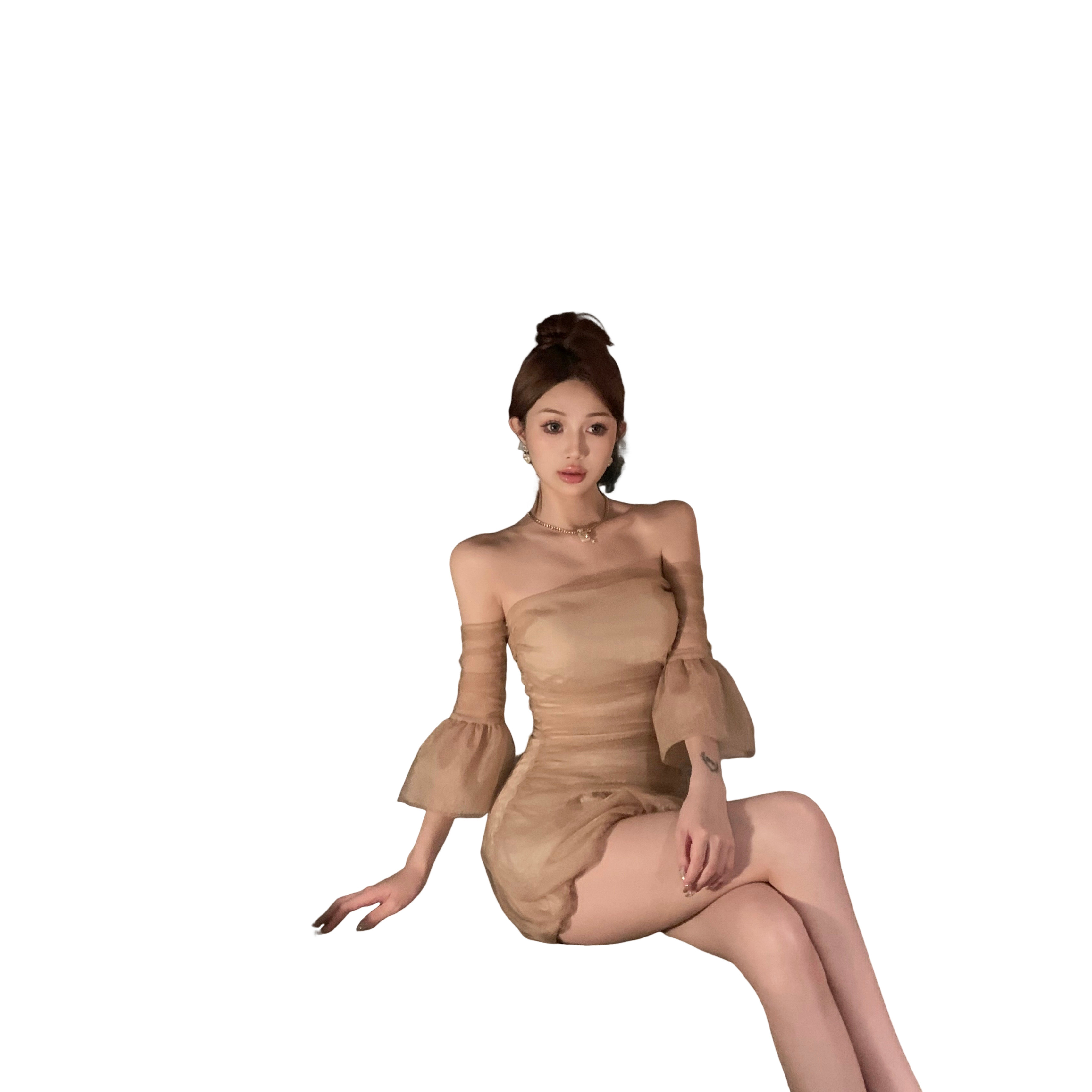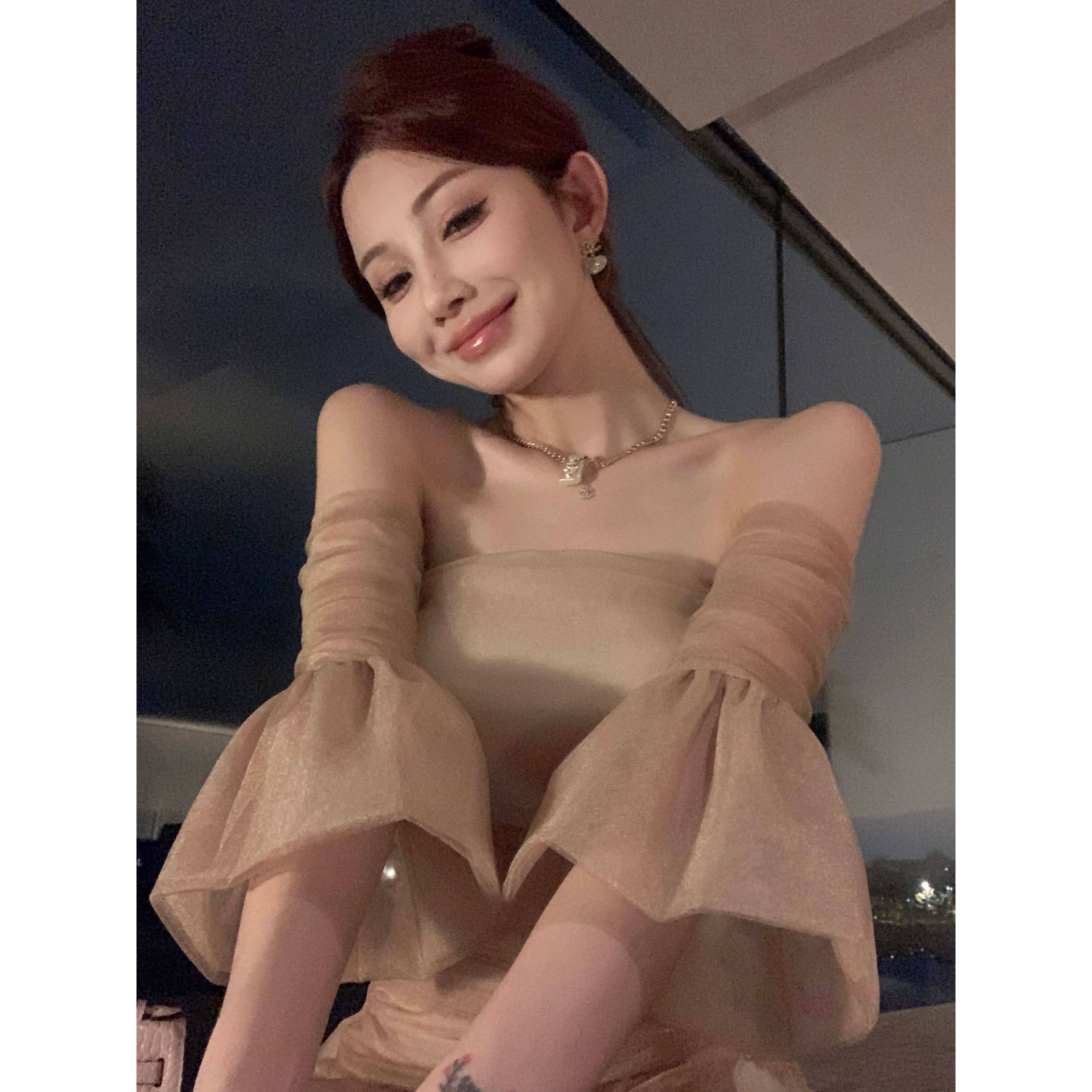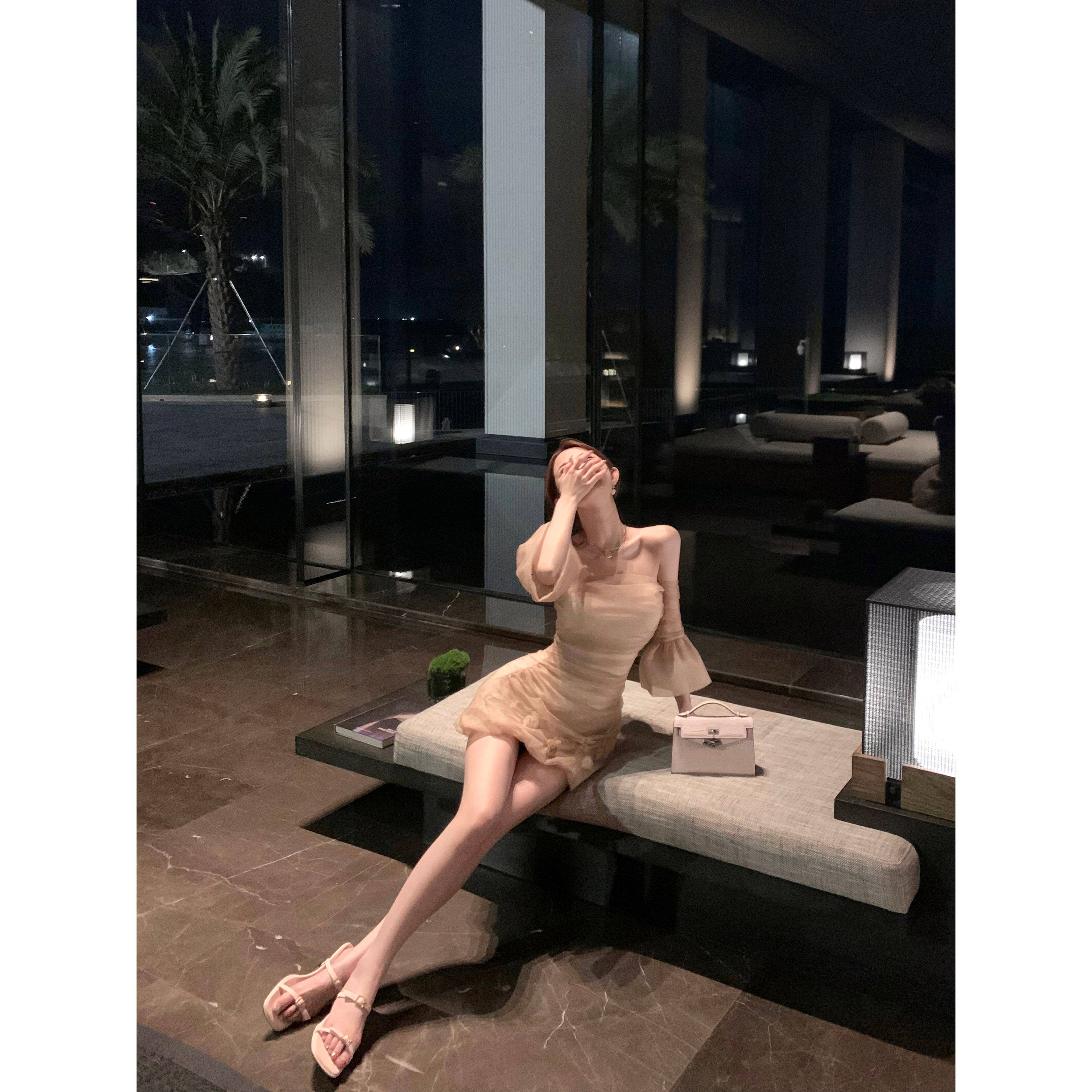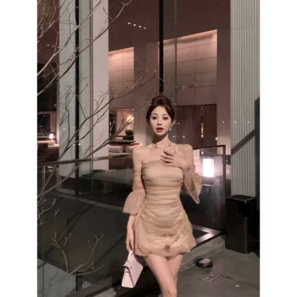 实拍 元英同款高级感重工手工订花网纱带袖套裹胸花苞连衣裙女夏