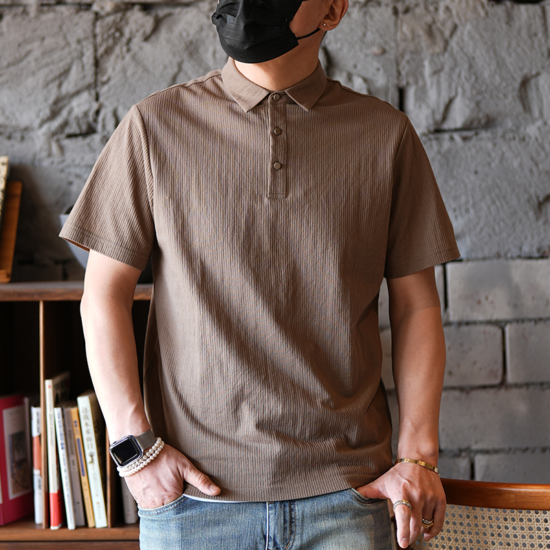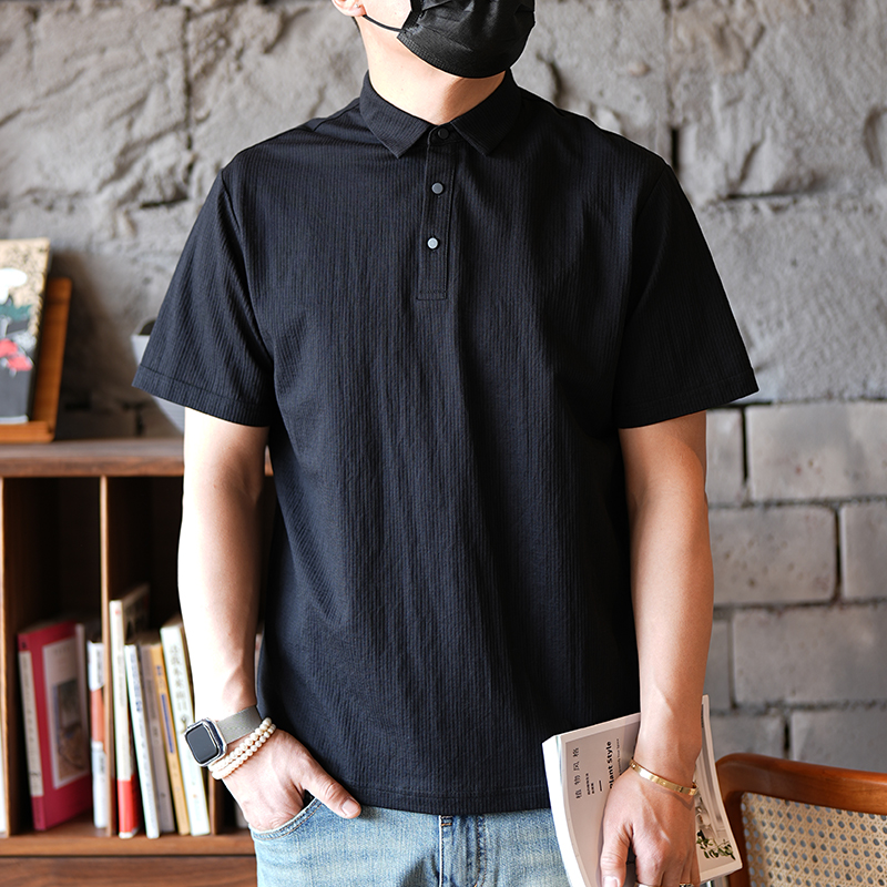春季潮流纯色纹理感帅气翻领短袖t恤男装复古高端翻领简约polo衫
