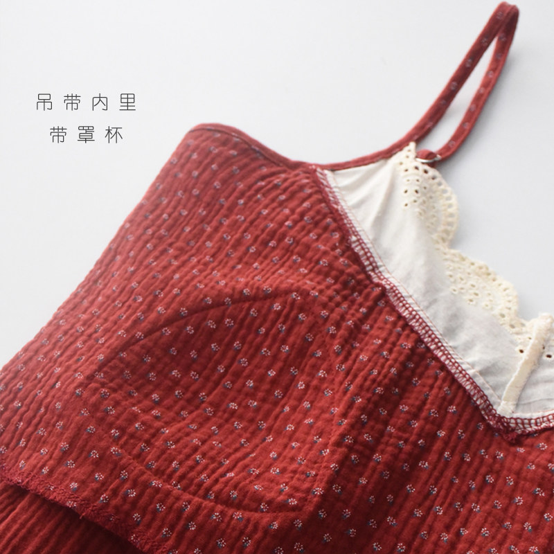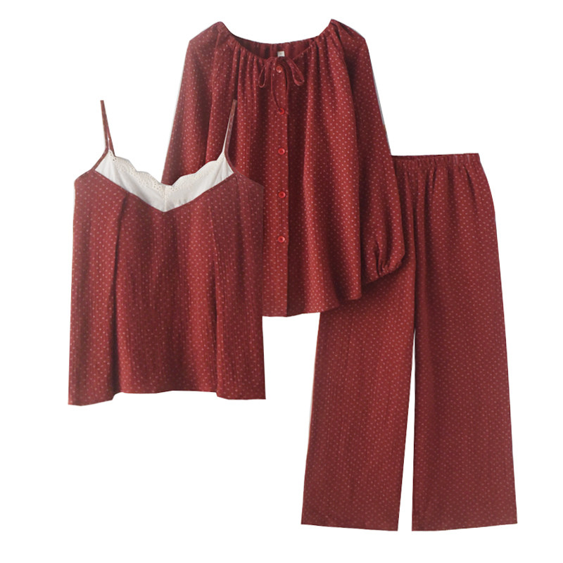 本命年红色睡衣女春夏纯棉纱布长袖带胸垫吊带长裤家居服三件套装