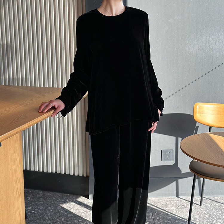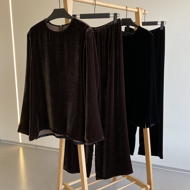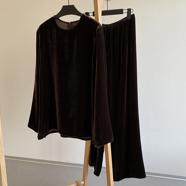 优雅高阶 中式老钱风柔软细腻真丝丝绒圆领上衣+一片式剪裁阔腿裤