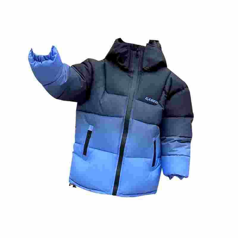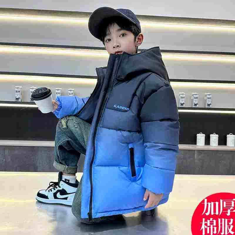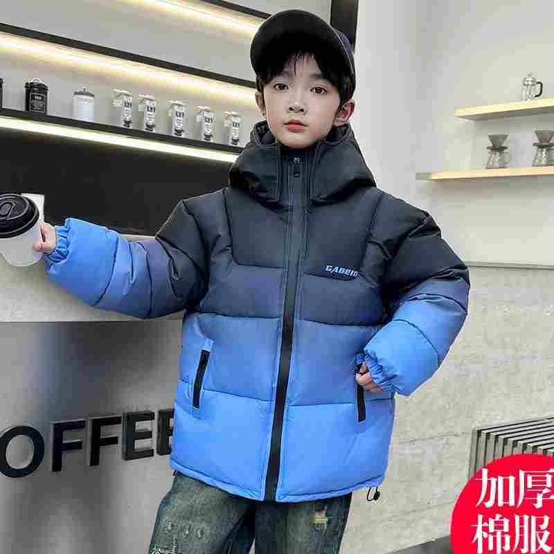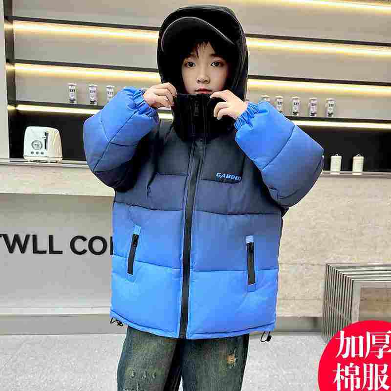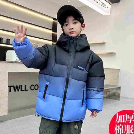 男大童冬季渐变蓝色连帽羽绒棉衣2025新款儿童冬装加厚棉服外套潮