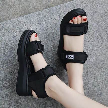 运动凉鞋女2025夏季新款学生平底百搭厚底松糕坡跟软底罗马沙滩鞋