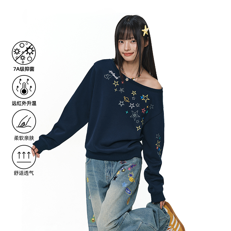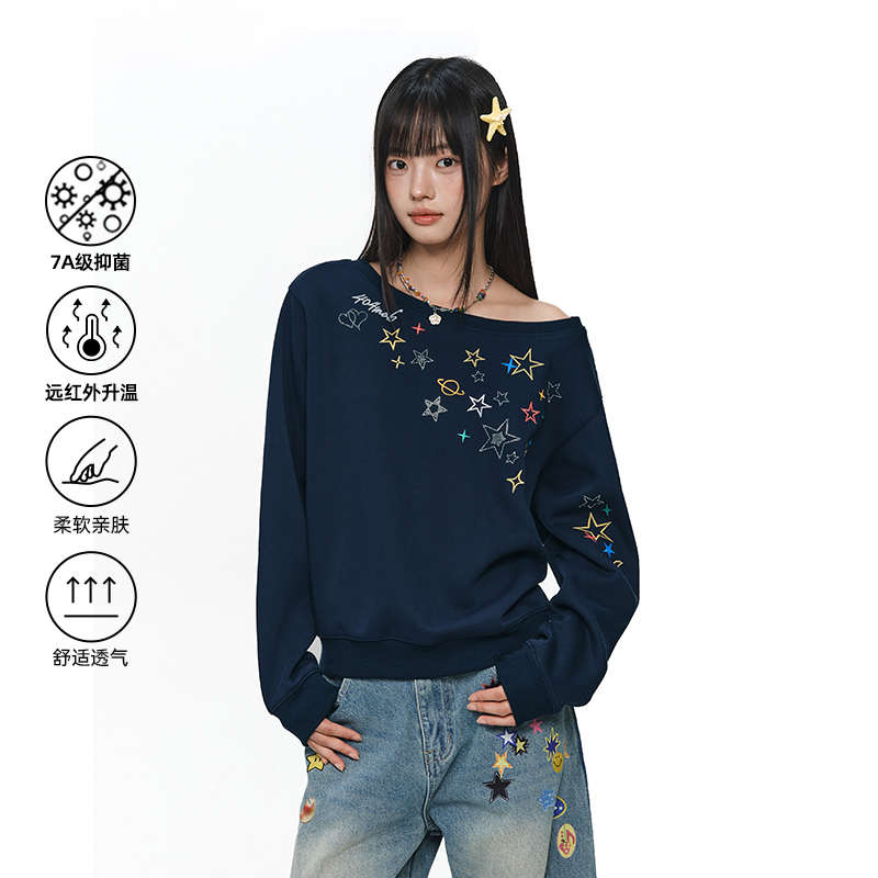 404MOB立体烫钻刺绣星星甜辣一字露肩圆领卫衣女秋季潮牌宽松上衣