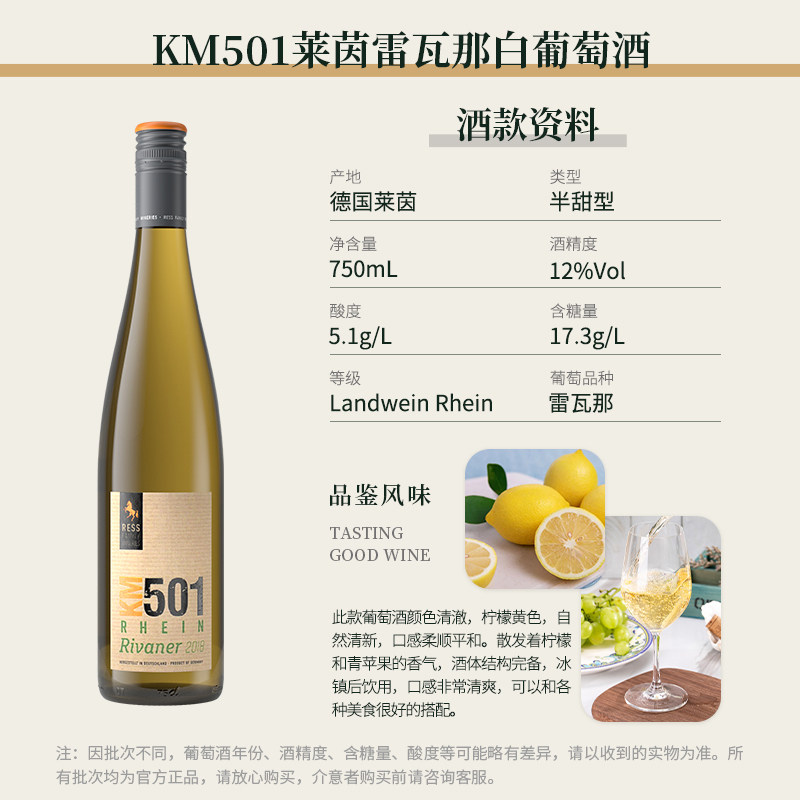 「188任选2瓶」KM501雷瓦那 半甜白葡萄酒德国莱茵原瓶进口微甜