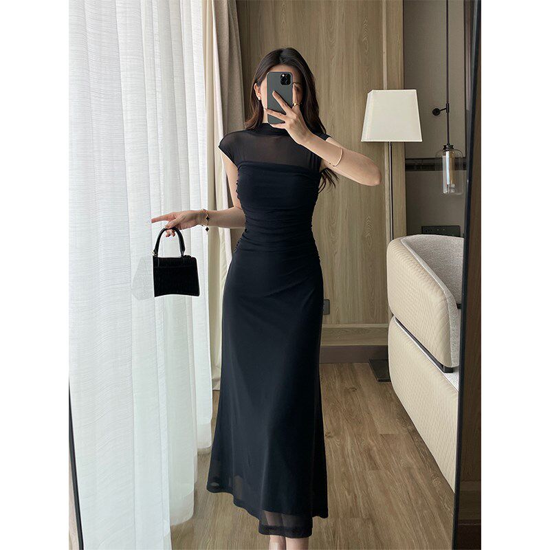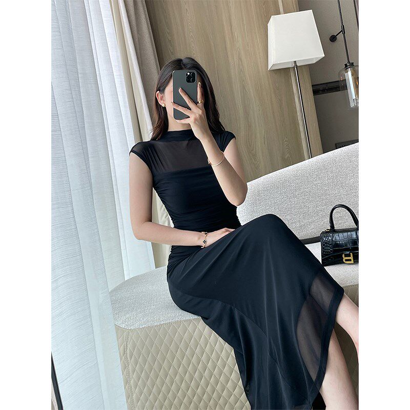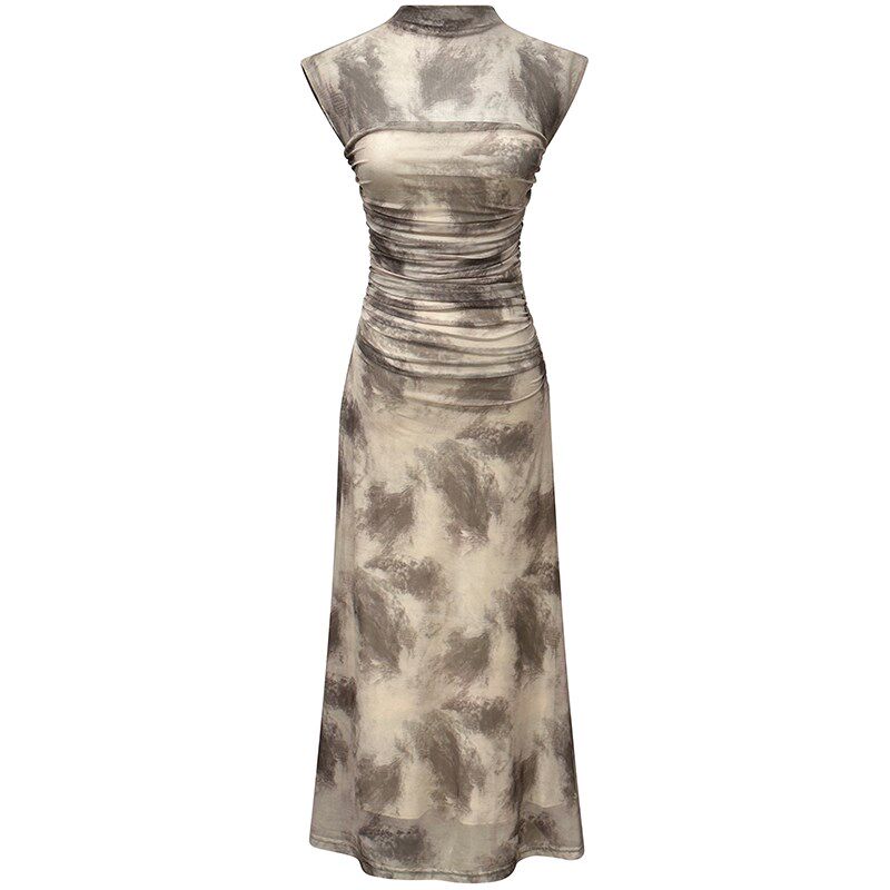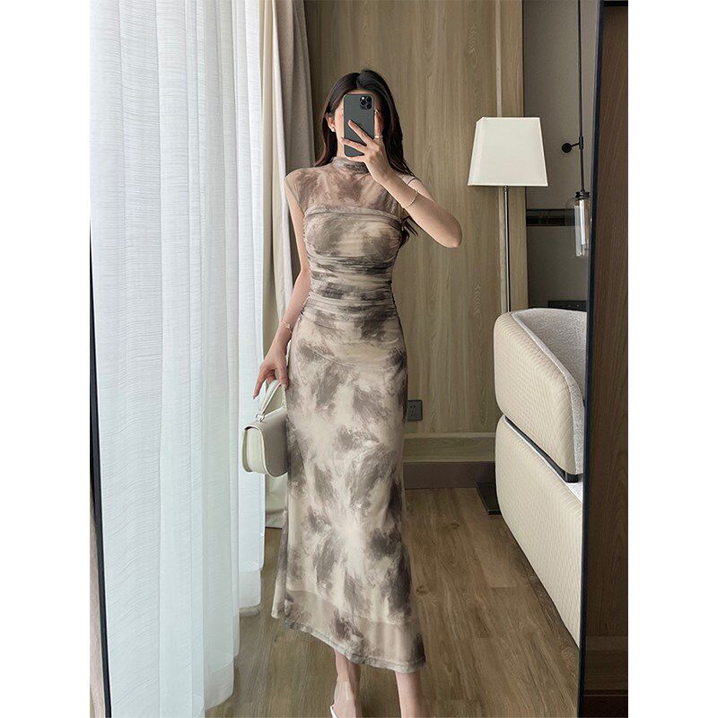 水墨晕染网纱连衣裙高端半高领无袖修身长裙夏季新款收腰褶皱裙子