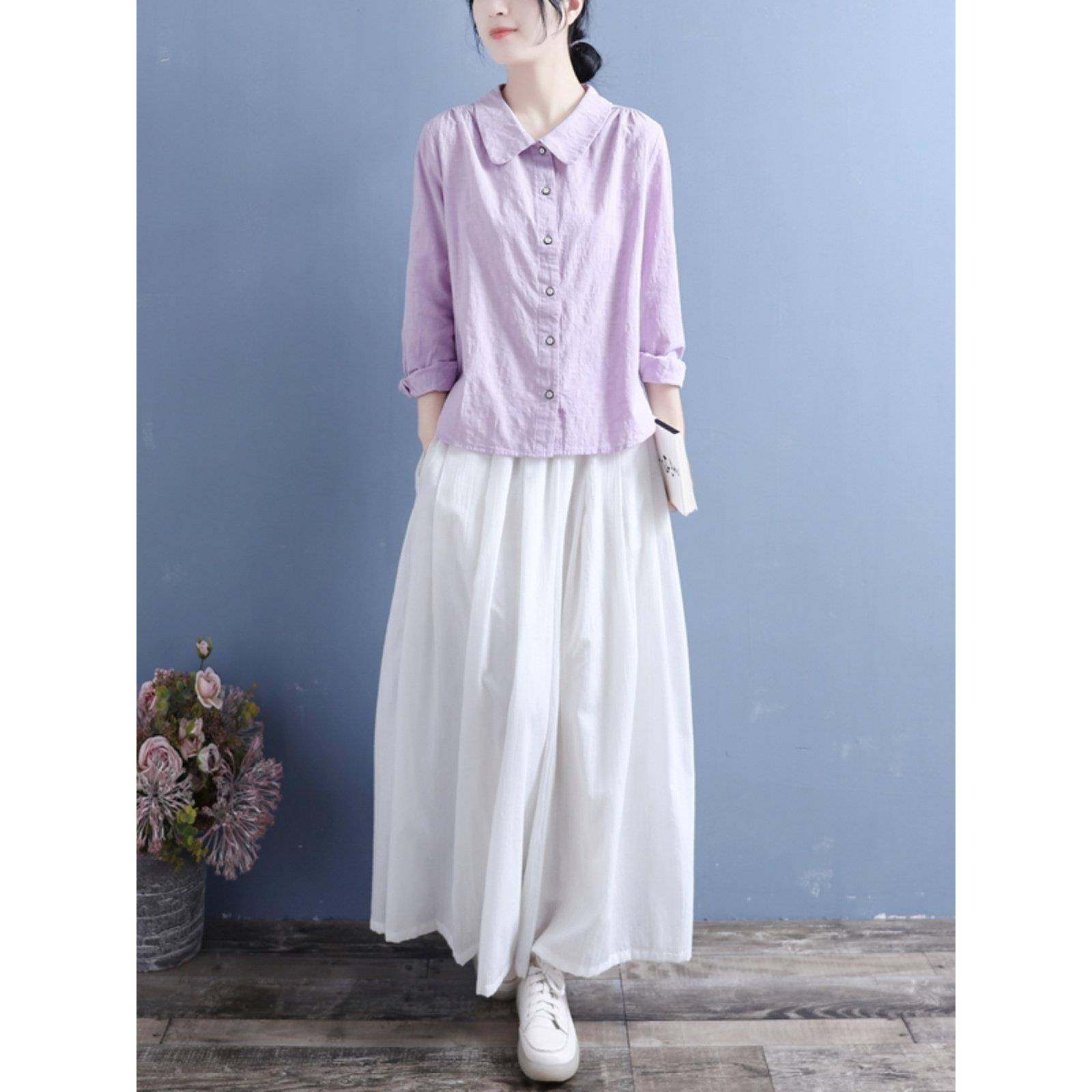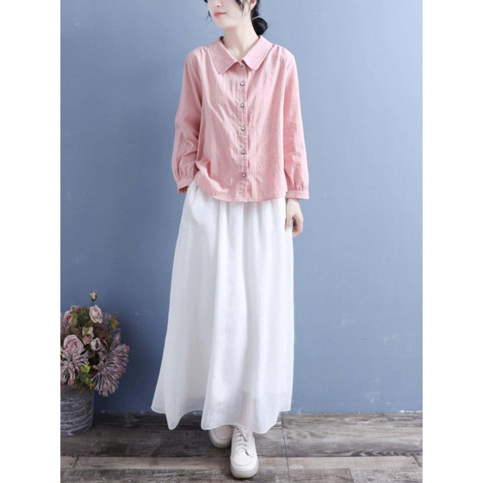 香港棉麻衬衫女春秋新款文艺覆古风娃娃领黑白扣提花宽松长袖上衣