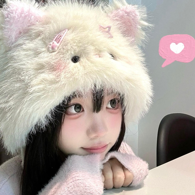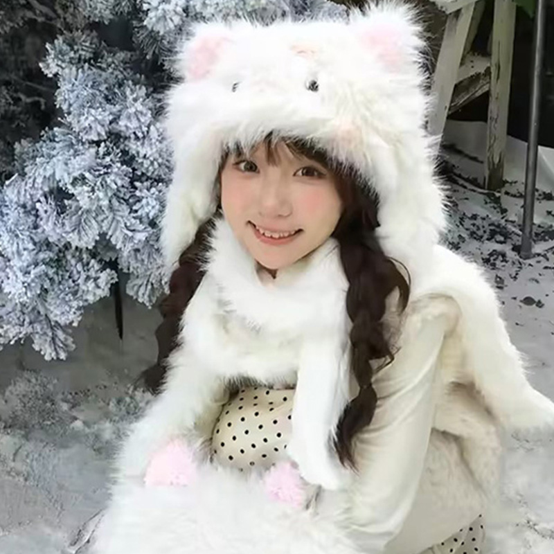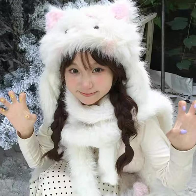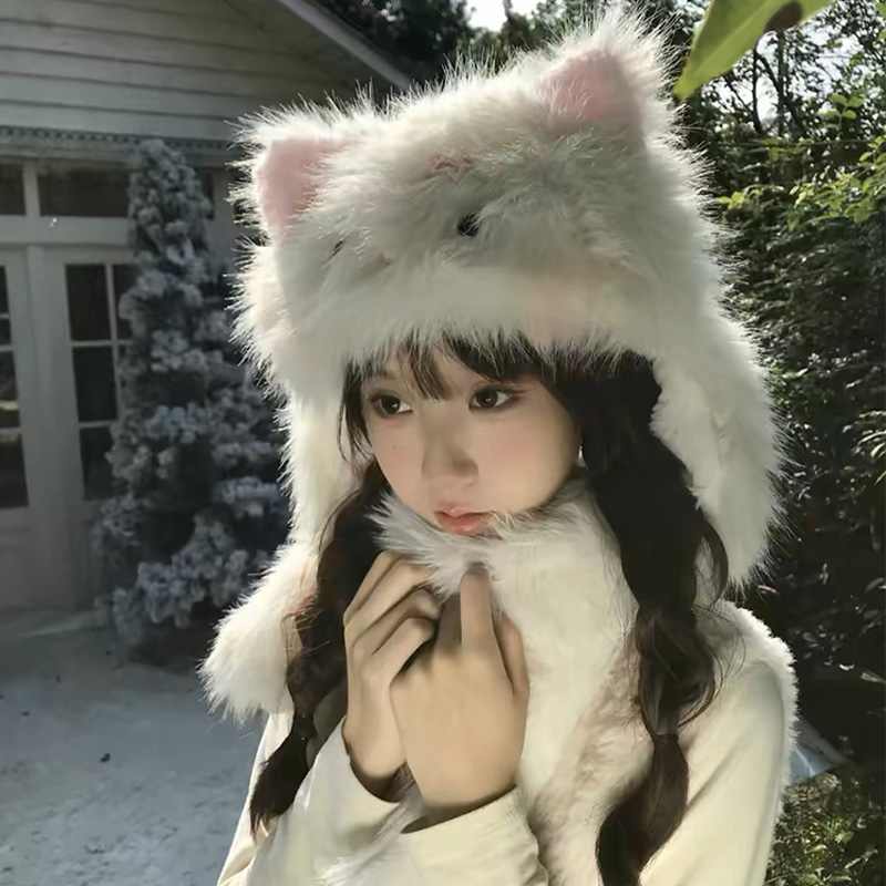 KELUSI联名款小猫咪耳朵帽子围巾一体女秋冬毛绒保暖防寒护耳帽脖