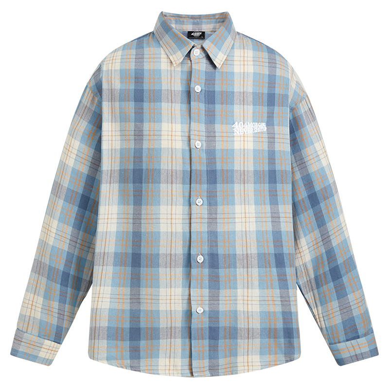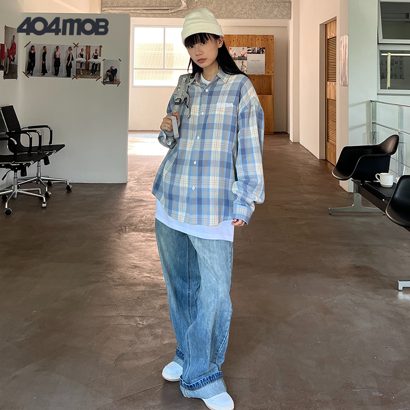 404MOB秋季复古薄款蓝白格子长袖衬衫男刺绣宽松休闲纯棉百搭外套