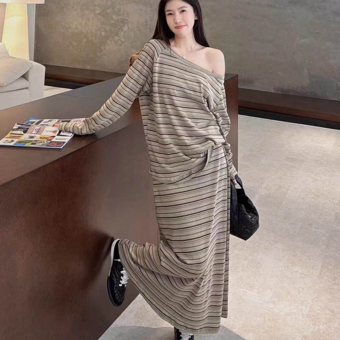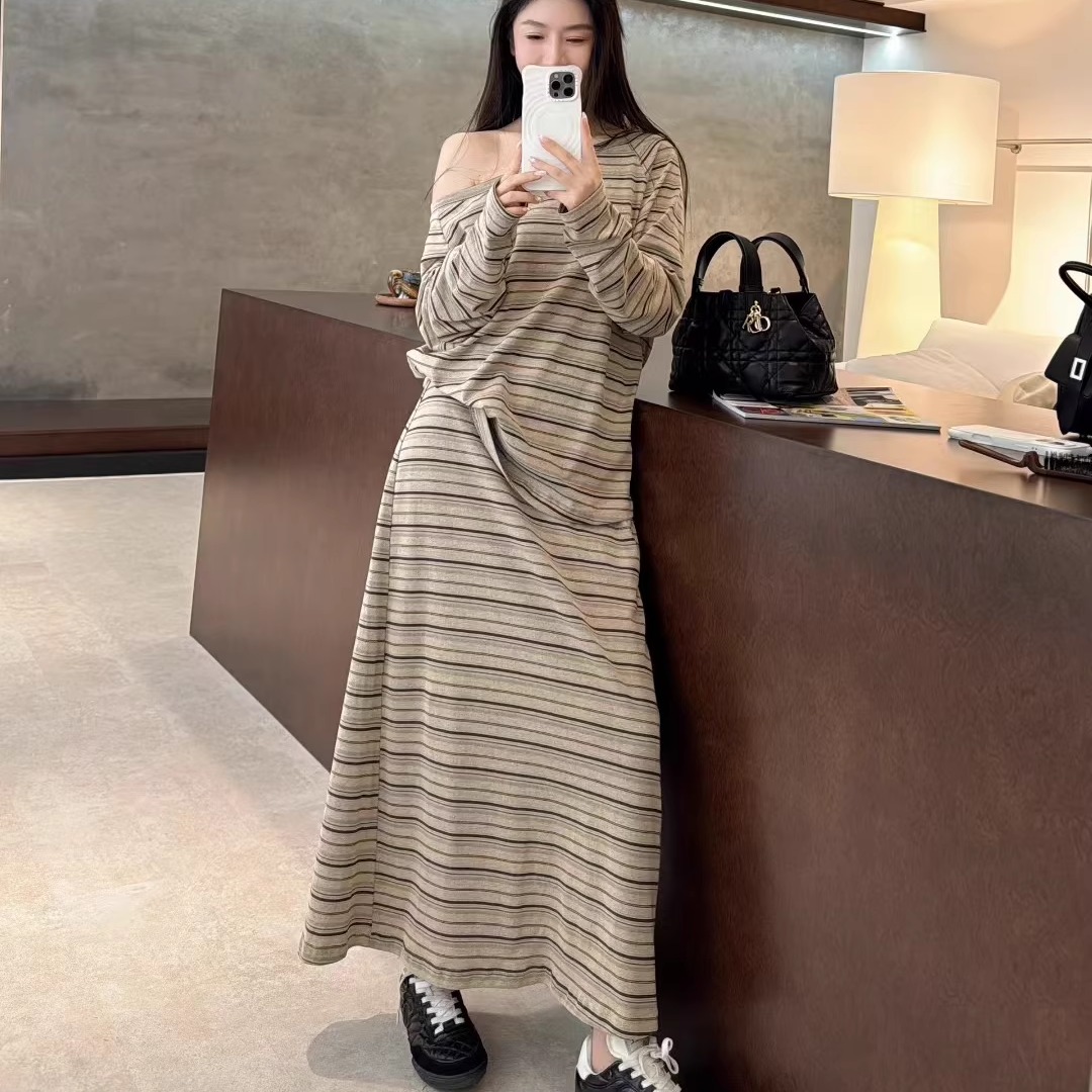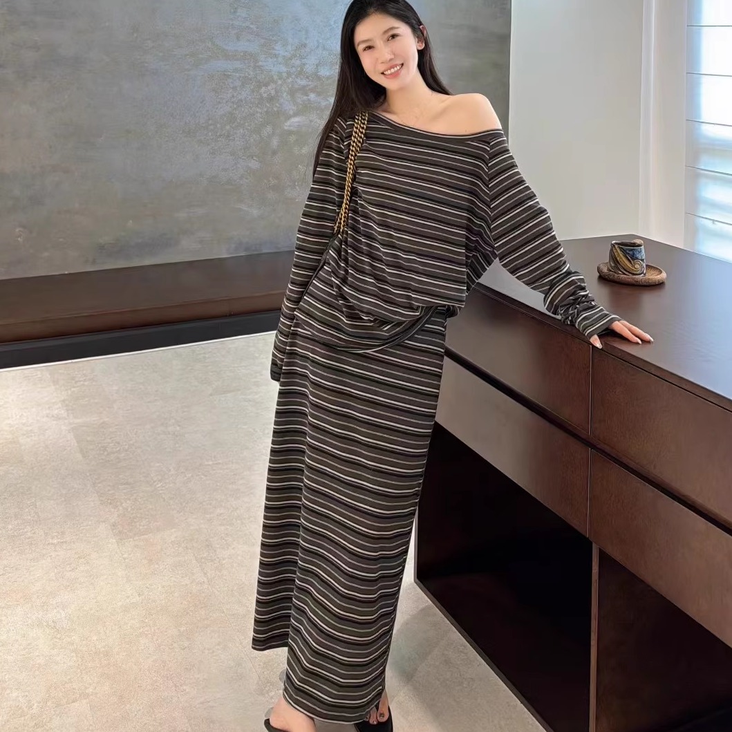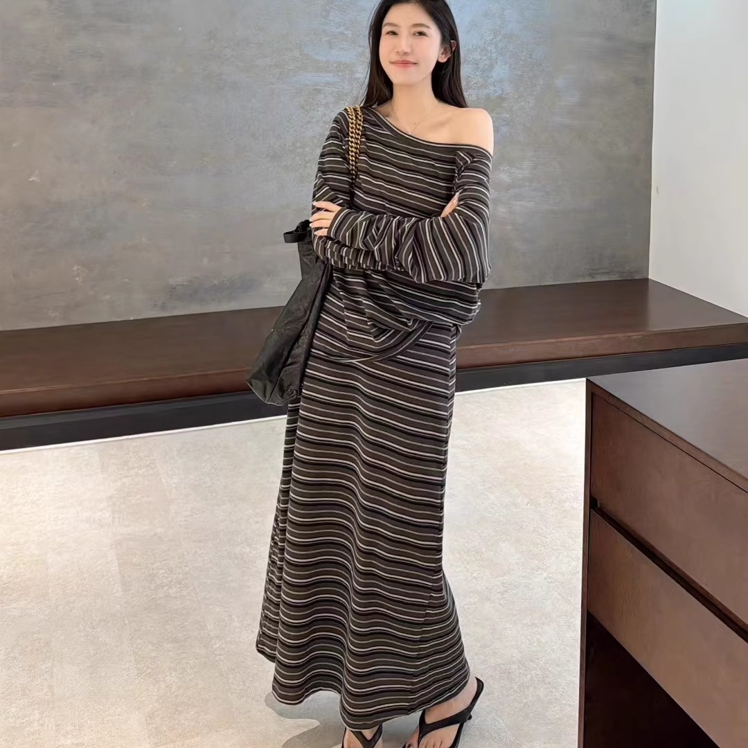 欧洲站2025秋松弛感一字领露肩长袖条纹T恤过膝长裙两件套套装裙