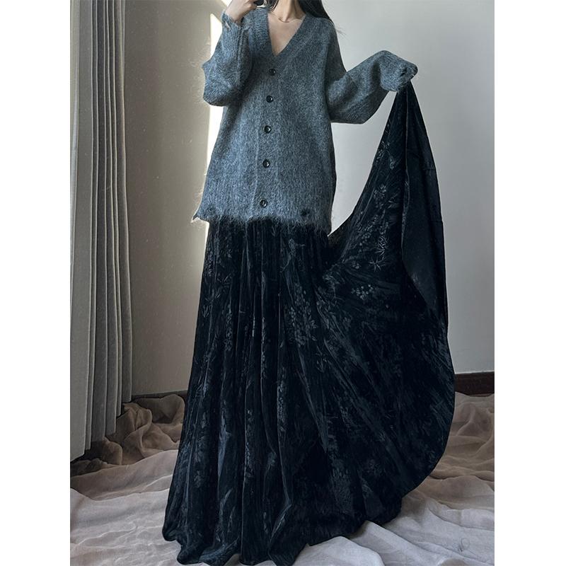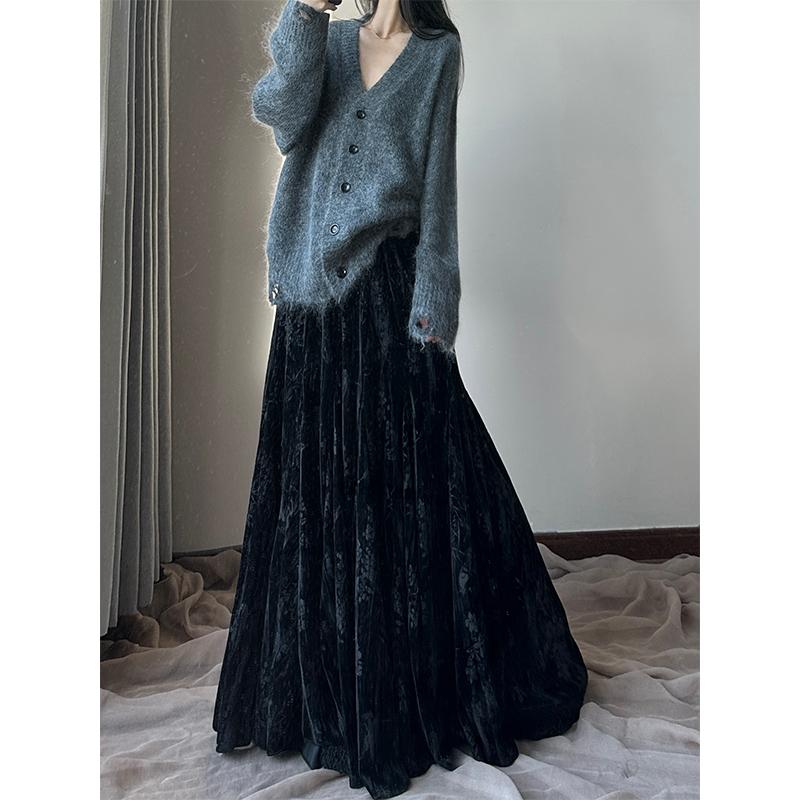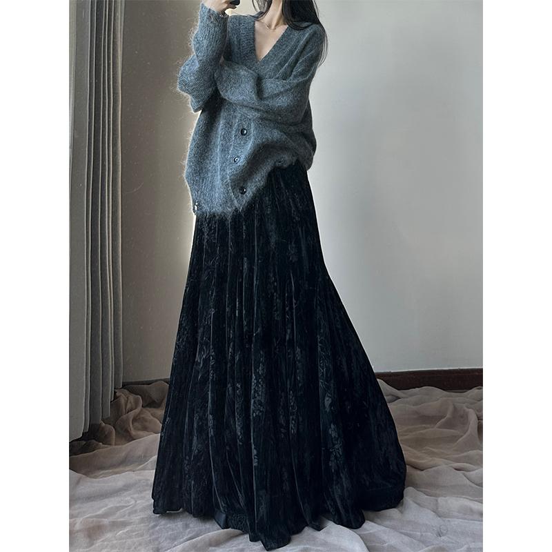 中式复古加长版黑色丝绒半身裙 秋冬垂感金丝绒鱼尾裙到脚踝长裙