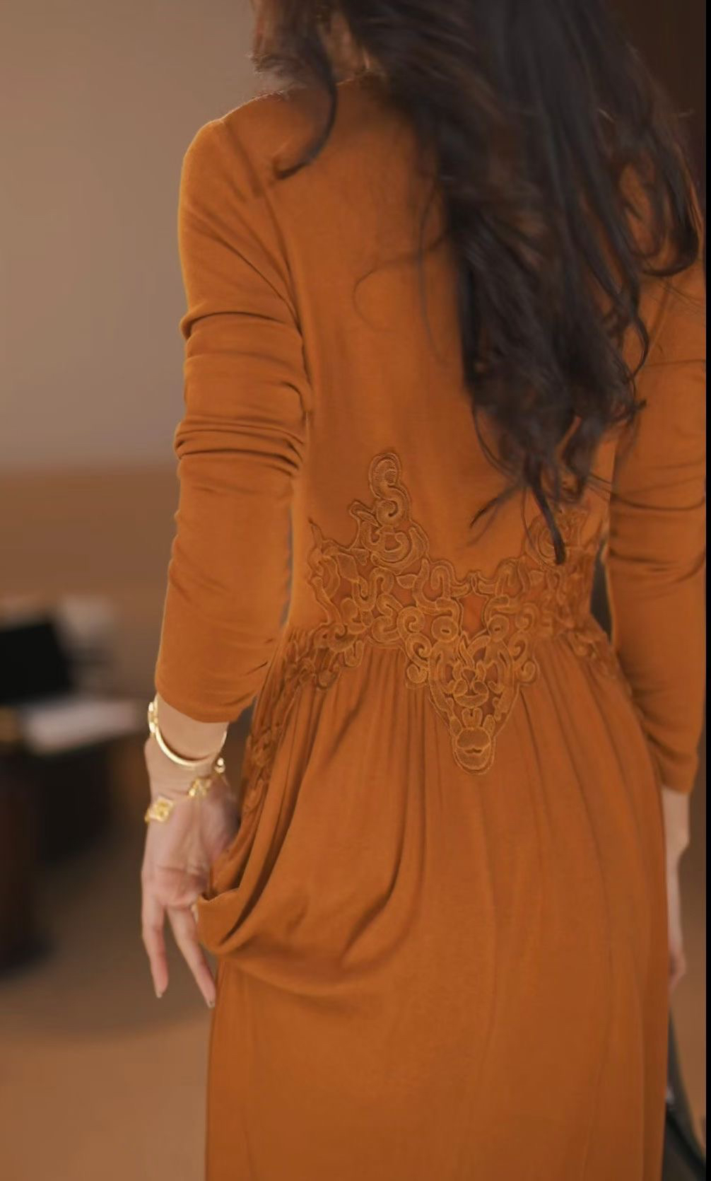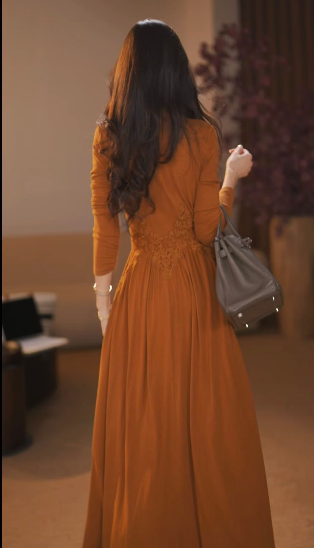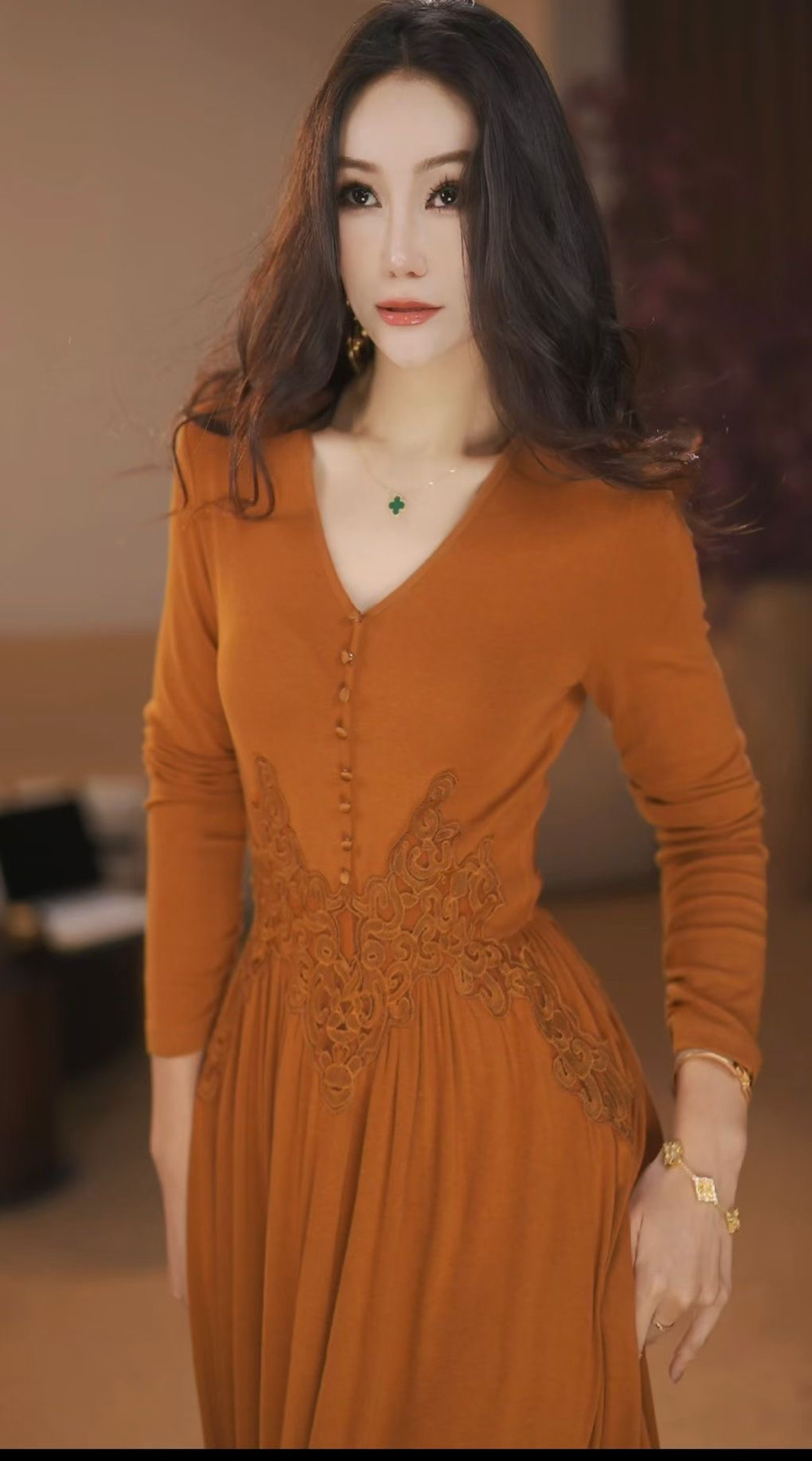袁小姐深圳南油2025轻奢时尚V领蕾丝拼接长袖连衣裙女修身显瘦潮