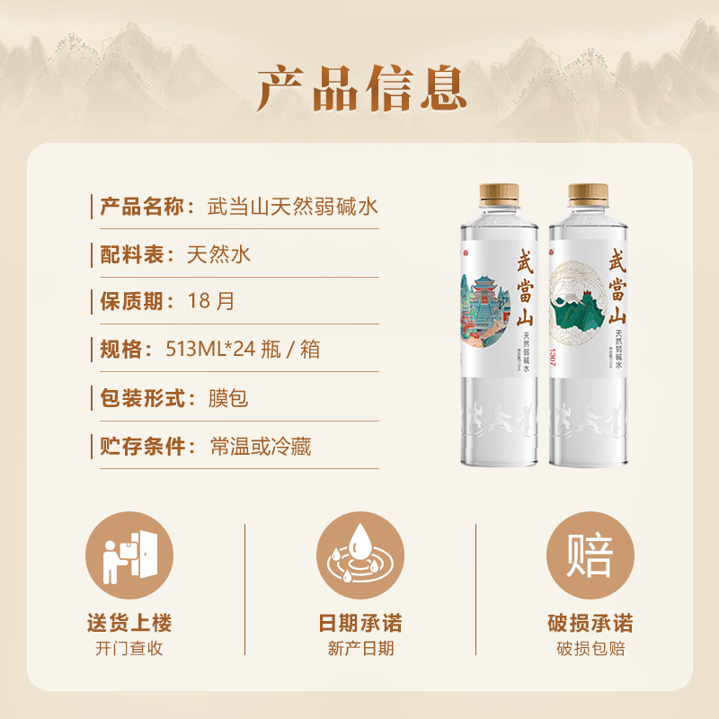 武当山天然水弱碱水513ml*24瓶整箱丹江口深层水源泡茶饮用水碱性