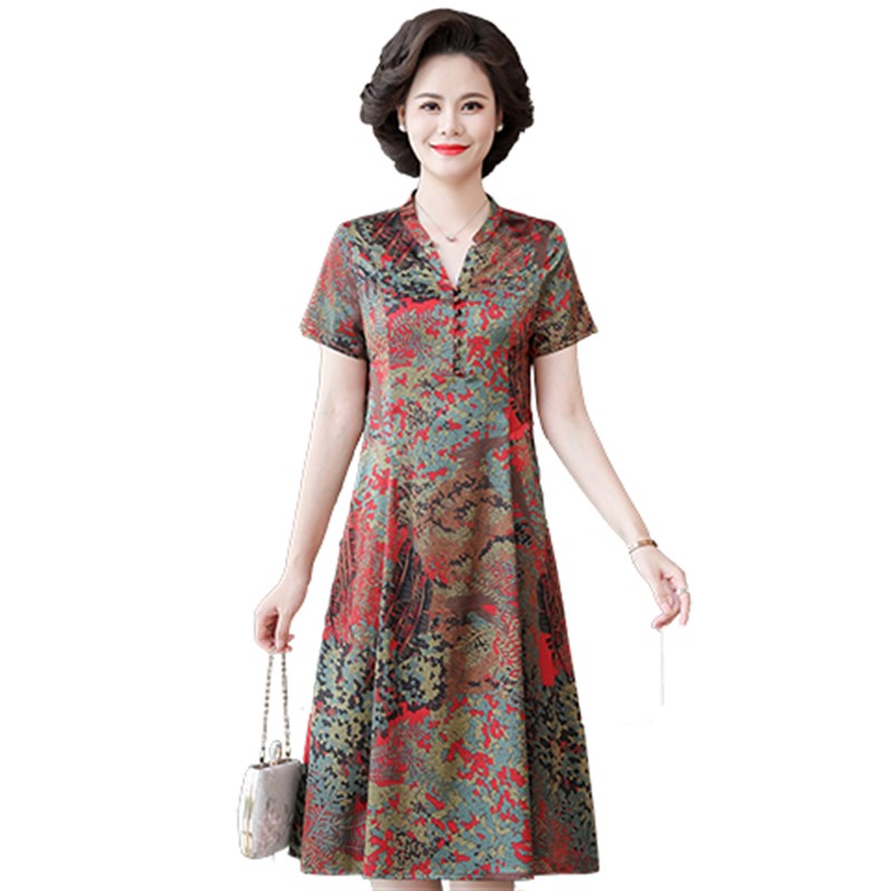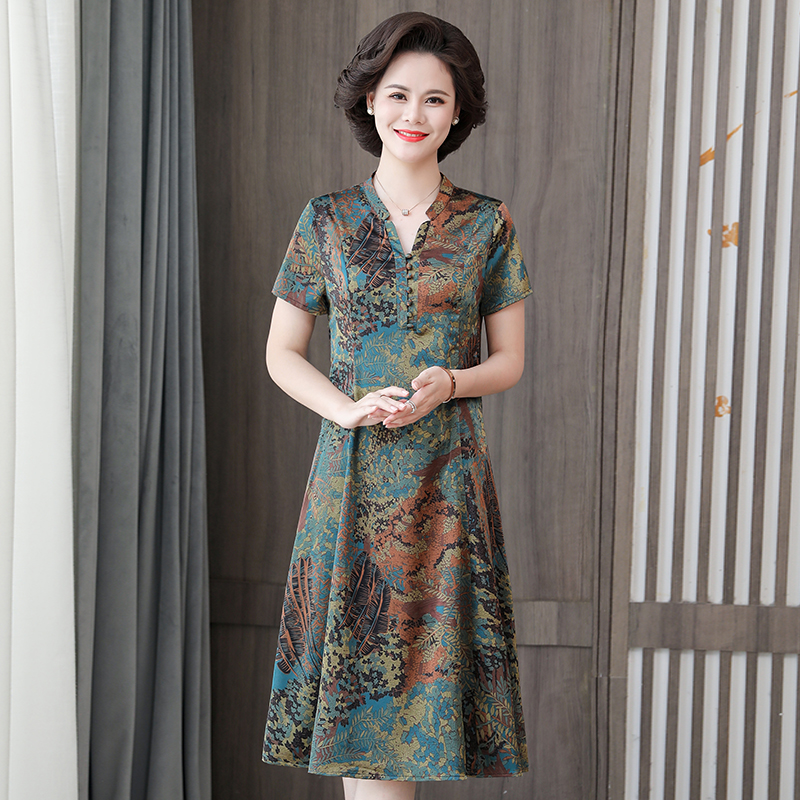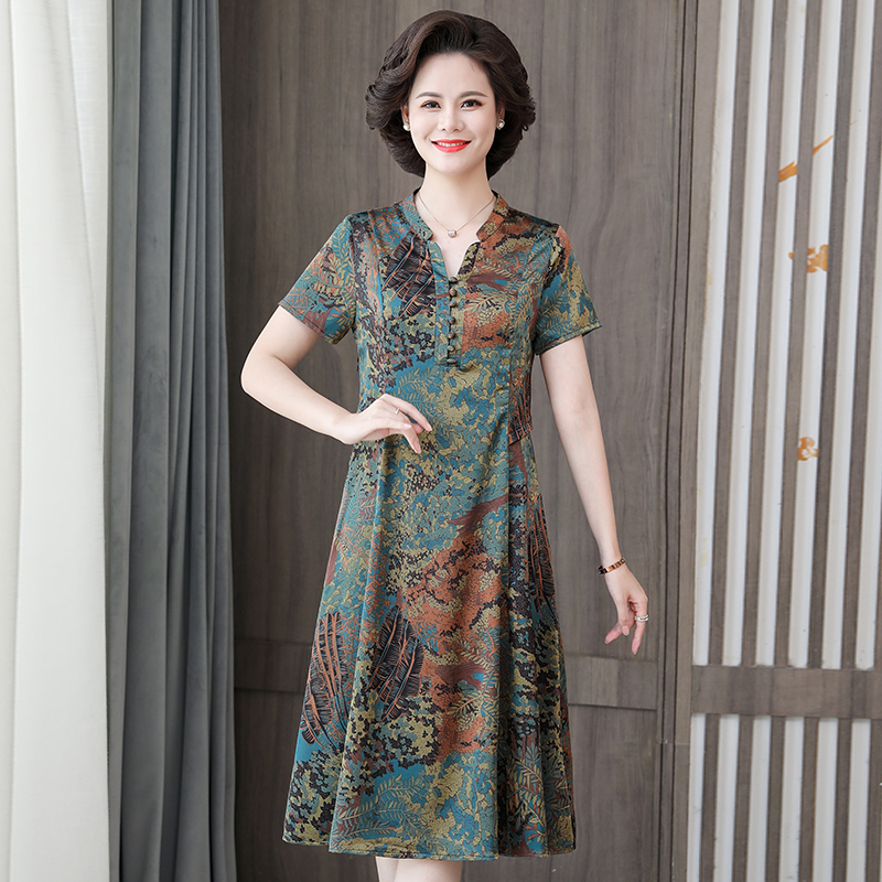高档中老年妈妈装连衣裙女中长款洋气遮肚子新款夏装收腰过膝裙子