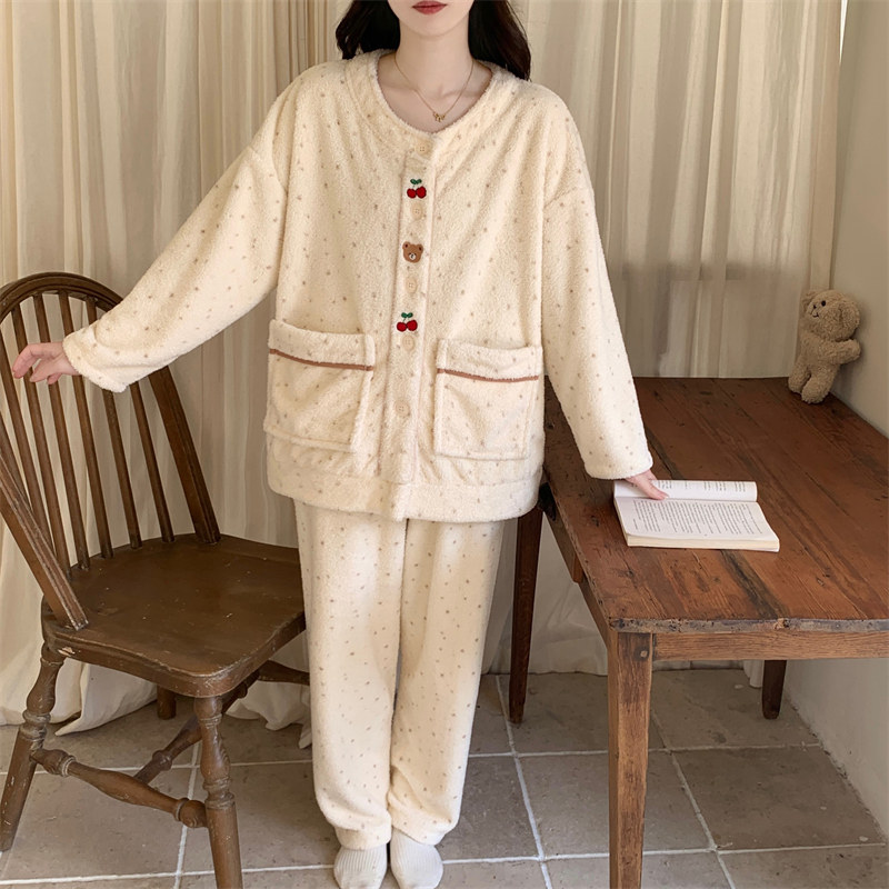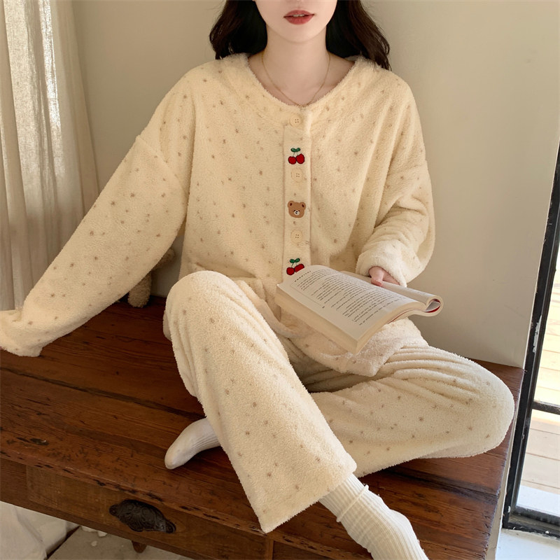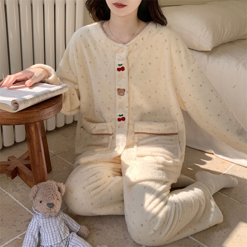 冬天保暖半边绒睡衣女款2025新款秋冬季加厚珊瑚绒卡通可爱家居服