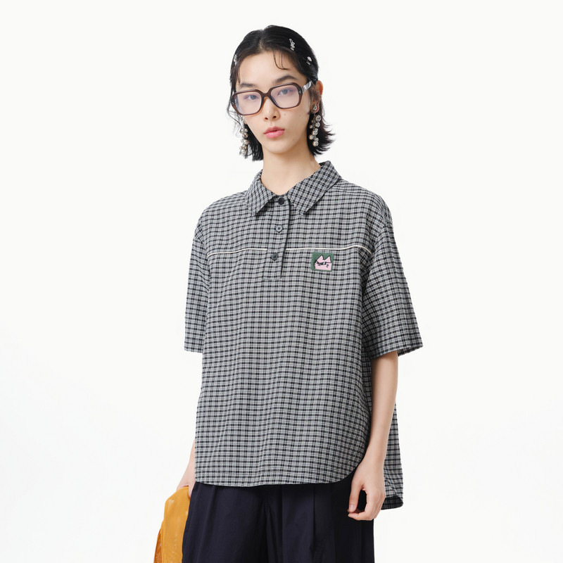 MOVEUP幻走2025夏季新款.FUN系列半开门筒收褶格子中长款衬衫女