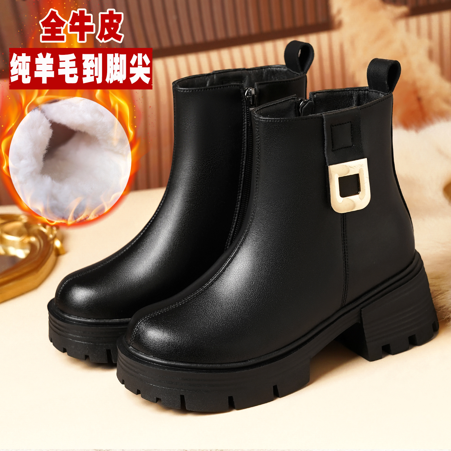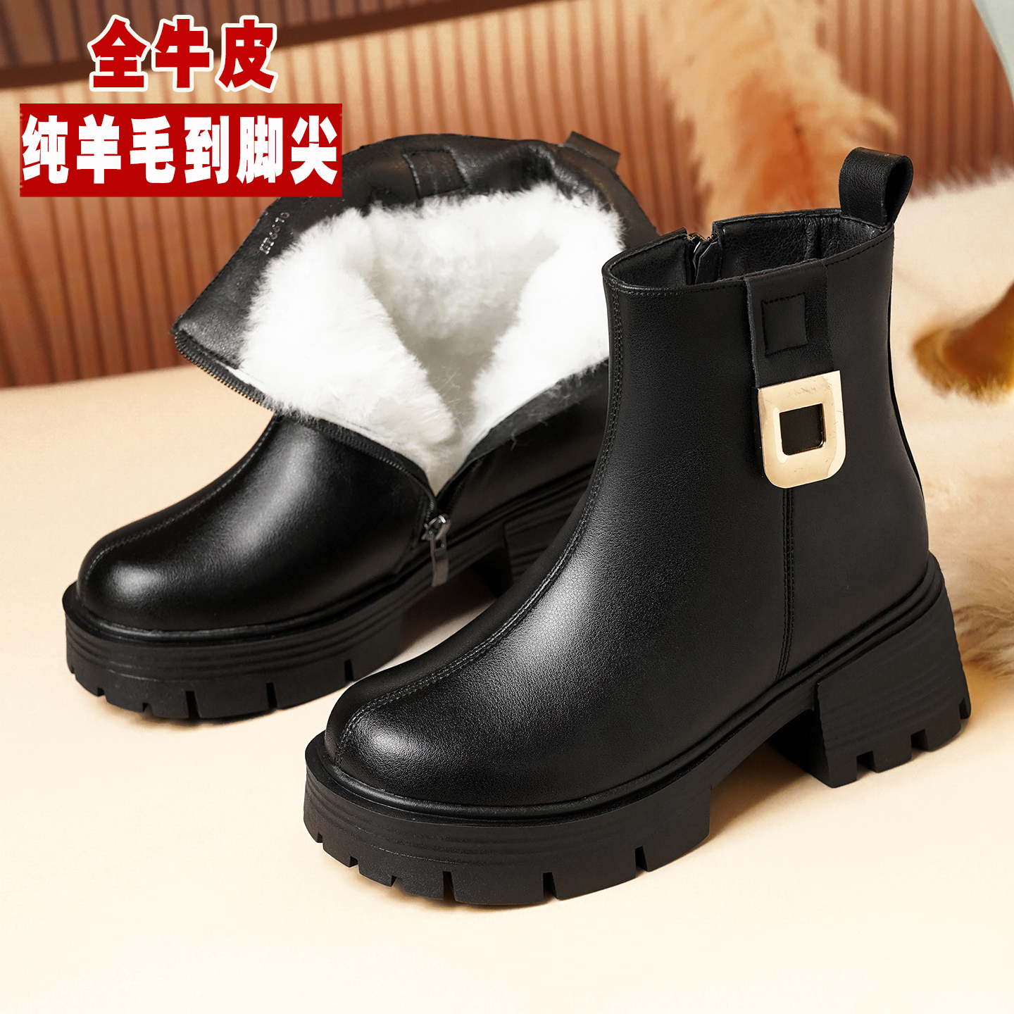高跟短靴子女款妈妈真皮棉鞋女士冬季加厚保暖羊毛皮鞋厚底雪地靴