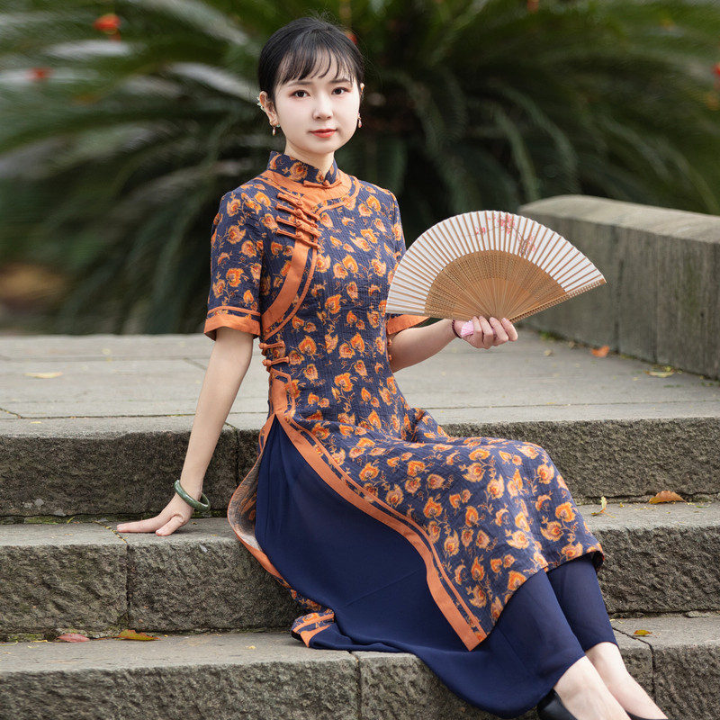 筠雅奥黛旗袍女装中国风夏连衣裙女洋气长款收腰显瘦时尚开叉裙子