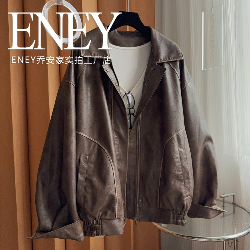 慵懒大版型哑光方真皮外套!ENEY复古皮衣女翻领宽松夹克外套咖色