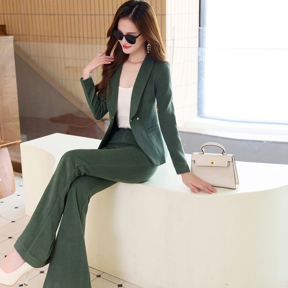 高级感绿色毛呢套装女冬装新款职业装气质时尚西装微喇叭裤两件套