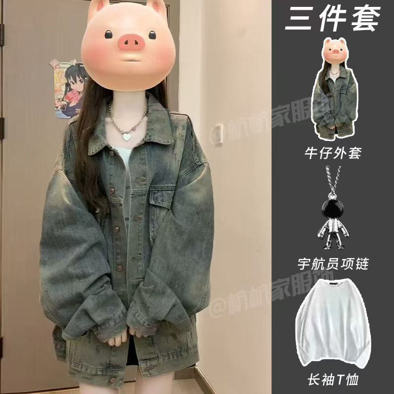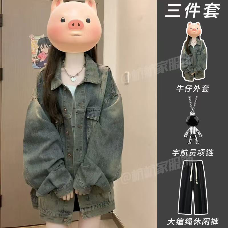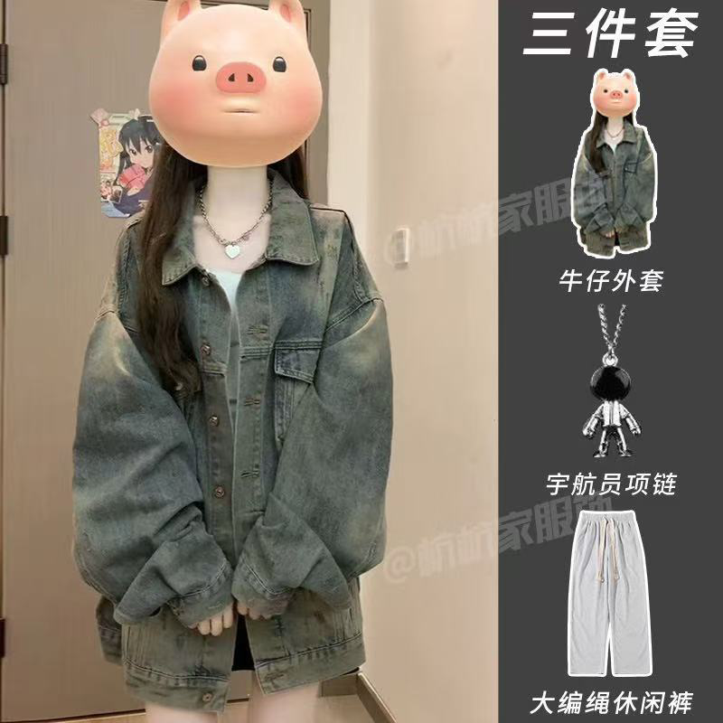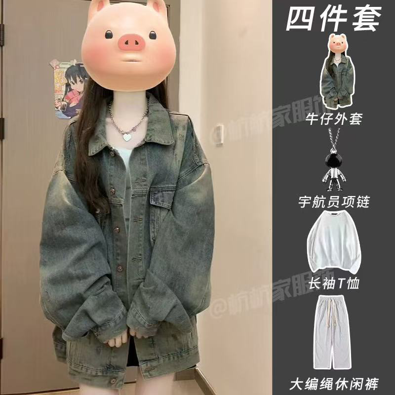 【四件套】美式水洗春秋牛仔外套女复古宽松夹克搭配休闲直筒长裤