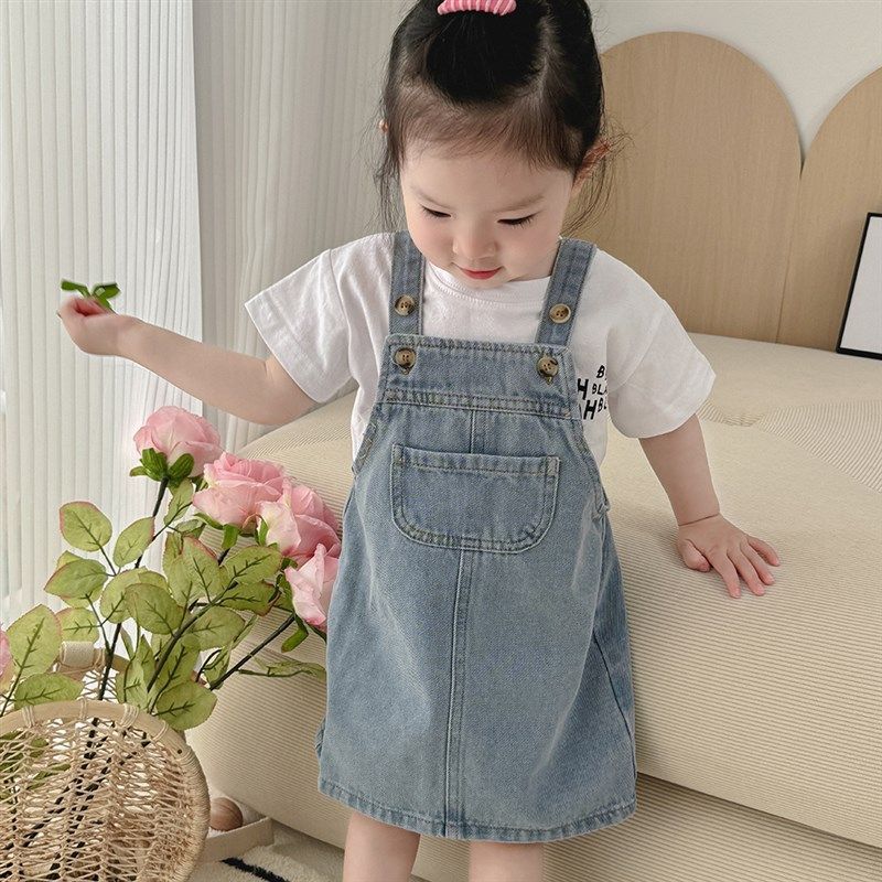 韩版女童夏季背带牛仔裙套装2024新款女宝宝儿童夏装洋气休闲裙子