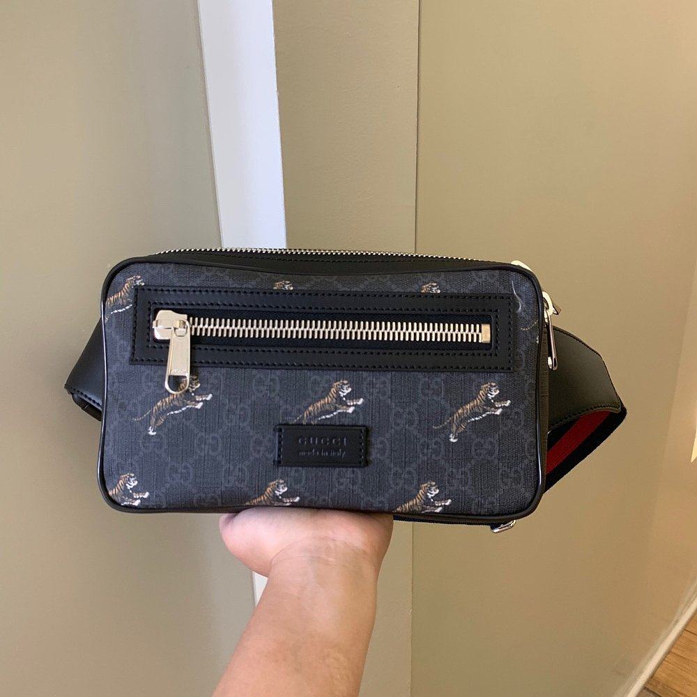 GUCCI 男士斜挎包 474293G02BN8992 AW2022 黑色 老虎印花腰包
